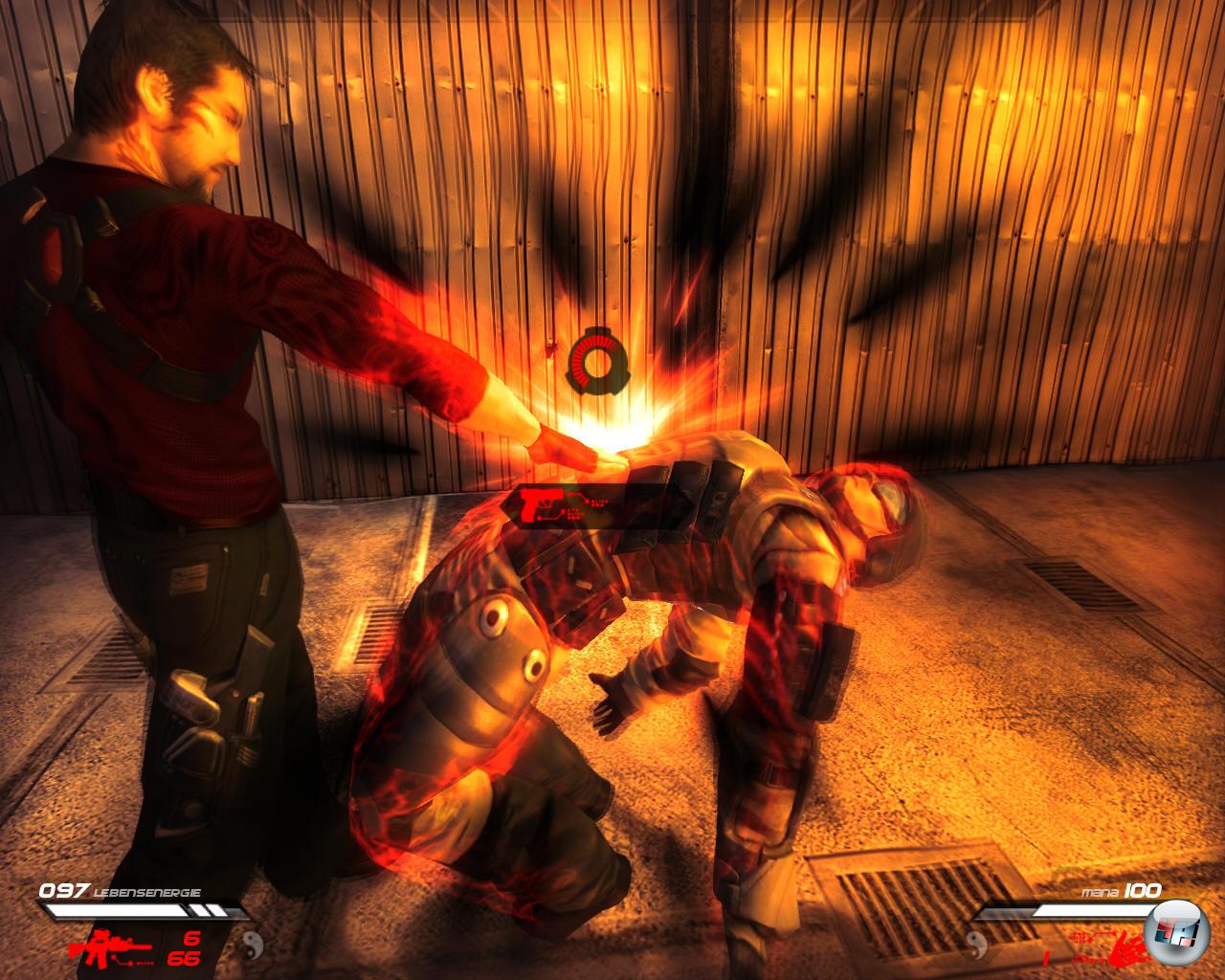 Als verlängertem Arm des Gesetzes der Hölle stehen Ryan neben den üblichen weltlichen Argumentationsverstärkern auch diabolische Kräfte zur Verfügung: Gleich die erste ist mangels Heilpäckchen sehr nützlich, denn er kann besiegten Gegnern in dramatischer Präsentation (der Bildschirm färbt sich blutrot, wabert leicht, mächtige Lichtstrahlen überall) die Seele aussaugen! Danach bleibt von dem entgräteten Widersacher nicht mal mehr die schlaffe Hülle übrig, er löst sich in Wohlgefallen auf. Das hat neben dem Gewinn an Lebensenergie auch gleich noch den Vorteil, dass ihr die Taschen des Opfers nach Waffen und Munition durchwühlt. Ausgefallen, aber auf Dauer etwas lästig, da unnötig zeitaufwändig. Dennoch ausgefallen. Weiterhin kann sich Ryan begrenzt teleportieren, was nicht nur dazu dient, an sich unerreichbare Schalter zu bedienen, sondern sich auch in den Rücken von frontal zu gut gepanzerten Gegnern zu beamen, und sie von dort aus einfacher zu erledigen. Am besten mit dem infernalen Schussverstärker, der die normale Waffenfunktion ordentlich potenziert. Praktisch auch Höllensicht und Telekinese, kann man doch mit Ersterem versteckte Zugangscodes finden und mit Zweiterem im Weg stehende Kisten   |