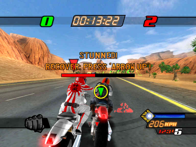 Nicht nur grafisch, sondern auch beim Umfang haben die Entwickler auf Sparflamme gekocht und spendieren Solo-Bikern lediglich einen einzigen Spielmodus, bei dem man in mickrigen acht Szenarien mit insgesamt 24 öden Strecken diverse Fahrmissionen absolviert. Diese sind immerhin abwechslungsreich geraten und reichen von einfachen Rennen über Hotlaps und Ausscheidungskämpfe bis hin zu Gang-Reibereien, bei denen ihr ähnlich Domination einen Gegenstand von einem Checkpoint zum nächsten transportiert, um zu punkten. Anscheinend haben die Entwickler Gefallen an dem PSP-Hit Pursuit Force gefunden, denn auch in Jacked könnt ihr die Maschinen eurer Gegner übernehmen. Prügelt sie zuerst weich, drückt dann im richtigen Moment die X-Taste und schon geht das Rennen auf der Konkurrenz-Maschine weiter. In manchen Missionen besteht sogar das Ziel einzig darin, innerhalb eines Zeitlimits den Konkurrenten zu „jacken“ – so die Bezeichnung für die Bike-Übernehmen-Aktion. Was in einem Fahrerpulk noch eine einfache Aufgabe ist, wird mit