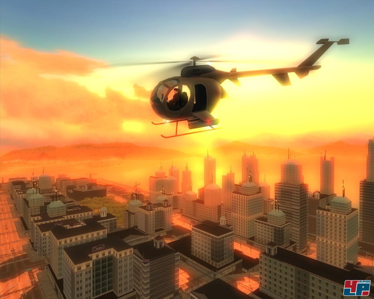 | Gibt es etwas Schöneres, als mit dem Heli (einem von über 90 Fahrzeugen) in den Sonnenuntergang zu fliegen? Hmm, vielleicht dabei etwas in die Luft jagen… |