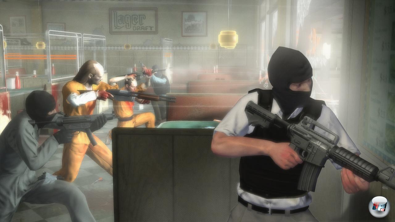 Der Einstieg in die Kampagne weckt Erinnerungen an die Anfangssequenz von Ubisofts Cell-Shading-Shooter XIII. Nach dem heftigen Crash nehmt ihr eure Umgebung zunächst nur verschwommen wahr und torkelt eher unbeholfen euren bewaffneten Befreiern und Lynch hinterher, während die Unfallstelle schnell von Cops umstellt ist. Doch sobald ihr selbst die erste Knarre in der Hand haltet, seid ihr bereit, euch mit bleihaltigen Argumenten zur Wehr zu setzen. Die ersten Feuergefechte sind bereits sehr intensiv und geben euch einen Vorgeschmack auf das, was euch noch erwartet. Im Prinzip sind die ersten beiden Kapitel ein Tutorial unter realen Gefechtsbedingungen. Neben grundlegenden Funktionen lernt ihr hier auch, wie das Deckungssystem funktioniert und wie ihr Lynch Befehle geben könnt. Später habt ihr sogar ein ganzes Squad unter eurem Kommando. Aus der Deckung heraus ist es möglich, entweder blind zu feuern oder die Gegner gezielt ins Fadenkreuz zu nehmen. Leider fällt die Handhabung etwas fummelig aus: Kane geht lediglich an Ecken in die entsprechende Deckungsposition. Wollt ihr z.B. an einer Wand schon vorher Schutz suchen und euch dann langsam wie bei R6: Vegas oder GRAW 2 an eine Ecke vorpirschen, ist das hier in dieser Form nicht möglich. Zumindest könnt ihr euch geduckt bewegen, wenn ihr den linken Bumper gedrückt haltet. Im Gegensatz zu den genannten Ubisoft-Titeln dürft ihr bei Kane & Lynch jedem Teammitglied separate Befehle erteilen. Wer jetzt Panik bekommt, dass der Titel damit zu einem reinen Taktik-Shooter mutiert, kann aufatmen: Zum einen seid ihr nicht das komplette Spiel als Team unterwegs und zum anderen ist das Befehlssystem sehr rudimentär. Ihr könnt eure Mitstreiter auf ein markiertes Ziel ansetzen, sie bei euch sammeln oder zu einem bestimmten Punkt schicken. Kommt euch bekannt vor? Kein Wunder, denn IO hat in Sachen „Teamtaktik“ fleißig bei den eigenen Spielen geklaut. Es müsste reichen, wenn ich sage, dass eines der insgesamt 16 Kapitel passenderweise „Freedom Fighters“ heißt.