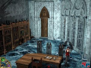 Die altmodische Grafik von Keepsake ist der Tatsache geschuldet, dass es sich um das Erstlingswerk der Wicked Games handelt, das ohne großes Budget entstand. So gibt es natürlich keine in Echtzeit berechnete 3D-Umgebung, sondern allenfalls durchschnittliche animierte 3D-Figuren, die vor gerenderten 2D-Hintergründen agieren. Auf der Treppe merkt ihr, dass die Figuren nicht optimal in die Umwelt eingefügt sind. Zak, der euch stets hinterher trottet, startet schon mal ein Überholmanöver, bei dem er unnatürlich schnell vorbei saust. Viele der Zwischensequenzen bieten keinen richtigen Film sondern nur Einzelbilder mit ein bisschen Bewegung drin. Draußen im Wald, wo eigentlich überall Bewegung zu sehen sein müsste, wirkt das Spiel arg statisch. Das gilt auch für den Bach, der nicht lebensecht sprudeln will. Immerhin ist den Macher zugute zu halten, dass sie sich im Rahmen ihrer Möglichkeiten Mühe gegeben haben. Stimmungsvoll ist das Adventure, was nicht zuletzt an der gotischen Architektur des Gebäudes liegt. Auch beim Lösen der Rätsel ist öfters ein wenig Bewegung drin. Einem Vergleich mit dem noch schöner gezeichneten Syberia hält es dennoch nicht stand.