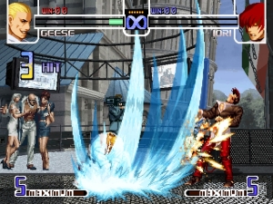 Ganz grob beschrieben erwartet euch hier ein Bitmap-Prügler in schönster SNK-Serientäter-Tradition: handgezeichnete Figuren dreschen wild aufeinander ein, wüste Pixel-Spezialeffekte erhellen den Fernseher. Der Prügel-Kader besteht aus satten 42 Protagonisten aus allen Serien, wobei einige klassische Figuren wie Yashiro oder Shermie ein Revival feiern und Gestalten wie Geese Howard oder Mr. Big fehlen. Jede Figur hat ein umfangreiches Schlag- und Kick-Repertoire, ganz zu schweigen von den vielen Fingerverknoter-Spezialmanövern, die aber in einigen Fällen anders auszulösen sind als gehabt oder gar ganz fehlen. Das liegt hauptsächlich an dem neuen »Super Cancel System«: Mit dem können gewiefte Spieler Kombos mittendrin unterbrechen und in andere Kombinationen umwandeln – um den Fluss zu gewährleisten und die Spielbalance zu sichern, musste daher einigen besonders mächtigen Moves der Zahn gezogen werden. Aber keine Bange, dank des Wegfalls des bei Fans ohnehin unbeliebten Striker-Systems und der Wiederbelebung der MAX-Anzeige, mit der man besonders kraftvolle Spezialmanöver zünden kann, gestalten sich die Kämpfe abwechslungsreicher und offensiver als bei den meisten Serienbrüdern. Ihr tretet entweder allein oder zu dritt gegen die Feindhorden an, wobei ihr vor jedem Kampf aus zwei Gegnerteams