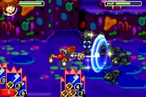 Im Schloss des Vergessens dreht sich alles um Karten – vergleichbar mit bewährten Systemen wie Magic – The Gathering oder Yu-Gi-Oh. Karten dienen dem Öffnen von Türen und dem Erreichen neuer Welten, aber hauptsächlich zum Kampf: Begegnet ihr einem Gegner, wechselt die Kamera von der üblichen Iso-Perspektive in eine schrägere Ansicht, und es wird drauflosgehauen. Allerdings nicht Buttonmasher-kompatibel wie im PS2-Original, sondern eher strategisch. Ihr habt ein Kartendeck, eure Gegner auch. Zwar prügelt ihr in Echtzeit auf eure Widersacher ein, aber im Prinzip bekämpft ihr nicht die Feinde direkt, sondern ihre Karten. Jede Spielkarte hat einen Wert, der geschlagen werden kann, hohe Karte gegen niedrigere. Ihr habt Angriffs- und Verteidigungsblätter sowie Spezialkarten, mit denen ihr eure Freunde (Donald, Goofy und später noch mehr) mit stärkeren Attacken auf die Feinde loslassen könnt. Außerdem dürft ihr Magie wirken, euch
