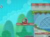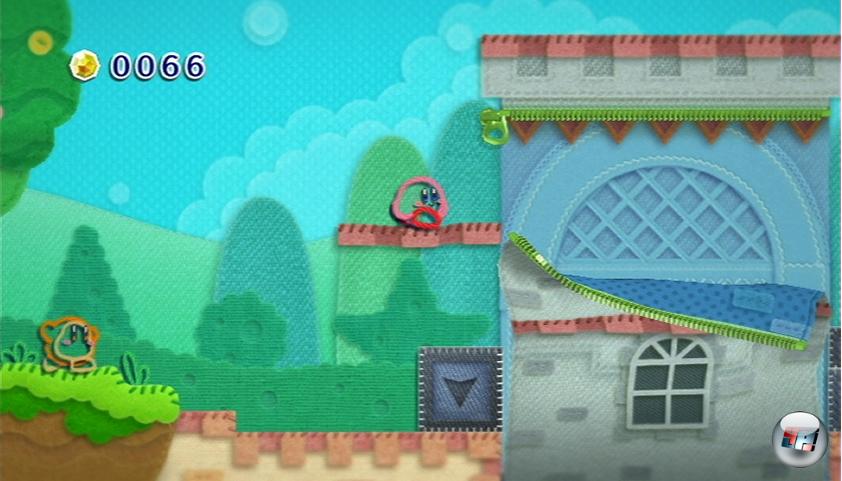 Würde KMG all diese Ideen haben, aber aussehen wie Ottonormal-Jump-n-Run, wäre es trotzdem schon ein Gewinner. Aber das ist nicht der Fall, denn zum cleveren Spieldesign gesellt sich eine extravagante Präsentation, die im Spielebereich ihresgleichen sucht: Alles, aber auch wirklich alles sieht so aus, als würde es Omas Strickkiste entspringen! Die Umgebung, Freund, Feind, alle Objekte, einfach alles besteht aus Wolle, Fäden, Knöpfen, Reißverschlüssen oder Stofffetzen. Okay, LittleBigPlanet <a class="DYNLINK" onmouseover="DynToolTipp_Show('Klicken für Gameinfos‚)“ onmouseout=“DynToolTipp_Hide(); “ href=“javascript:DynCont_Display(‚Gamefinder‘,’runmod.php?sid=%7BSID%7D&LAYOUT=dyncont_gf&spielid=11407′)“> ging in eine ähnliche Richtung, aber nicht mal ansatzweise so konsequent wie Kirby! Denn hier ist die Präsentation nicht nur die Visualisierung eines bestimmten Stils – nein, das ganze Spiel ist um dieses Thema herum gestrickt! Gegner werden nicht getötet oder aufgesaugt, sondern aufgedröselt. Der Stoffboden gibt bei jedem von Kirbys Schritten ein ganz klein wenig nach, so als würde er auf einem Teppich laufen. Betritt man ein Haus, verschwindet Kirby dahinter – klettert er nach oben, bewegt sich einfach ein Knubbel unter der Grafik, als würde sich eine Katze unter einer Bettdecke austoben. Neue Levels werden nicht einfach geöffnet, sondern teilweise bemerkenswert aufwändig frei animiert: Mal boxt ein Riese eine weitere Welt frei, mal pustet ein Lampengeist mächtig, mal wird ein riesiger Stoffkuchen Stück für Stück zusammengestellt. Und nicht zuletzt besteht sogar eine Trivialität wie ein Lensflare nicht einfach nur aus hellen Objekten, sondern aus hellen Stoffresten. Brillant!