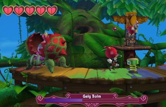 | Hier wird es endlich etwas kniffliger: Klonoa muss das Monster über seinem Kopf genau über dem fiesen Gelf Bolm in einem Doppelsprung nach unten jagen. |