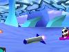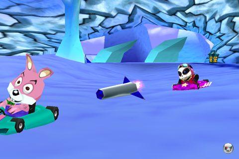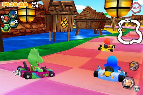 sondern bieten darüber hinaus auch viel Abwechslung. Vom kunterbunten Dorf über vereiste Winter-Landschaften bis hin zum düsteren Schloss mit brodelndem Lava-See laden die Schauplätze auf den ersten Blick zum fröhlichen Rasen ein. Schrecklich wird es erst, wenn Bewegung in die Sache kommt: Stellenweise heftige Ruckeleinlagen stehen hier an der Tagesordnung und machen dem Fahrspaß genau so einen Strich durch die Rechnung wie die schwammige Steuerung, mit der man die Karts in Kurven kaum auf der Strecke halten kann. Zumindest hat man die Wahl zwischen einer Lenkung via Kippbewegung oder mit Hilfe einer virtuellen Lenkleiste auf dem Bildschirm – wirklich gut funktioniert beides nicht. Auch ein manuelles Gasgeben ist nicht möglich, sondern einzig das Bremsen über ein kleines Feld, das genau über dem Aktivieren der Power-Ups gelegt wurde. So ist mir öfters passiert, dass ich aus Versehen mein Extra wie etwa den Geschwindigkeits-Boost aktiviert habe, anstatt zu bremsen. Darüber hinaus warten noch einige fiese Aktionen wie Zeitbomben, schwarze Löcher oder Raketen, mit denen man seinen fünf Konkurrenten das Leben schwer machen kann. Das ist alles nicht sonderlich kreativ, aber schlecht sind die Extras deshalb auch nicht, die genau wie bei Mario Kart durch das Durchfahren von Boxen aufgesammelt und zufällig bestimmt werden. Daneben müssen auch Hindernisse überwunden werden, indem man auf sein Gefährt drückt, das daraufhin einen kleinen Hüpfer hinlegt.![]()