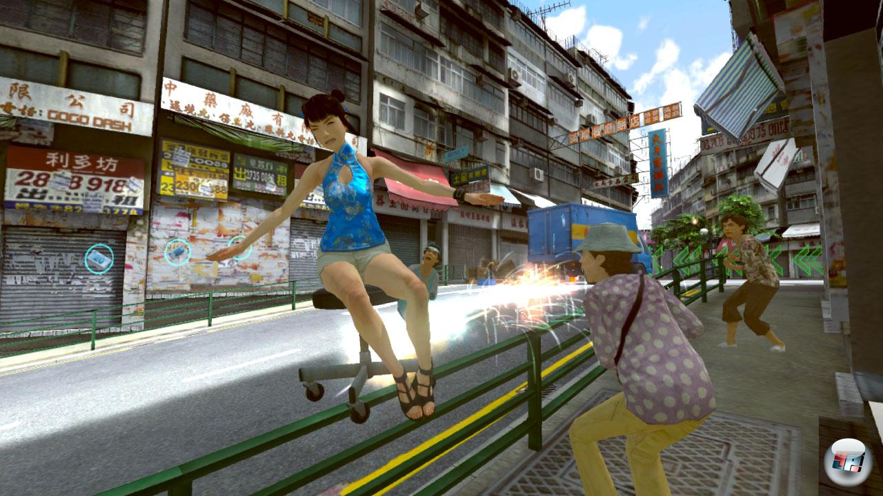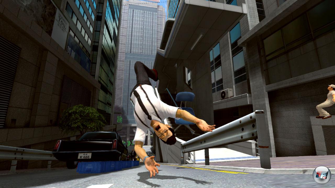 Und hier muss man gegen die Zeit einen Berg (naja, eher: Hügel) der fernöstlichen Metropole hinunter rasen, springen, grinden sowie Gegenständen ausweichen, um zu einem Kleintransporter, seinem „richtigen“ Fluchtfahrzeug, zu kommen – natürlich mit Move-Kontrolle. Allerdings hat man hier noch ein paar Möglichkeiten mehr zur Verfügung, da man auch mit Tritten, Drehungen und Schlägen gegen die mitunter unfair auf einen zu stürmenden Gangster herumfuhrwerken kann, während man Geld und allerlei Kleinkram einsammelt.