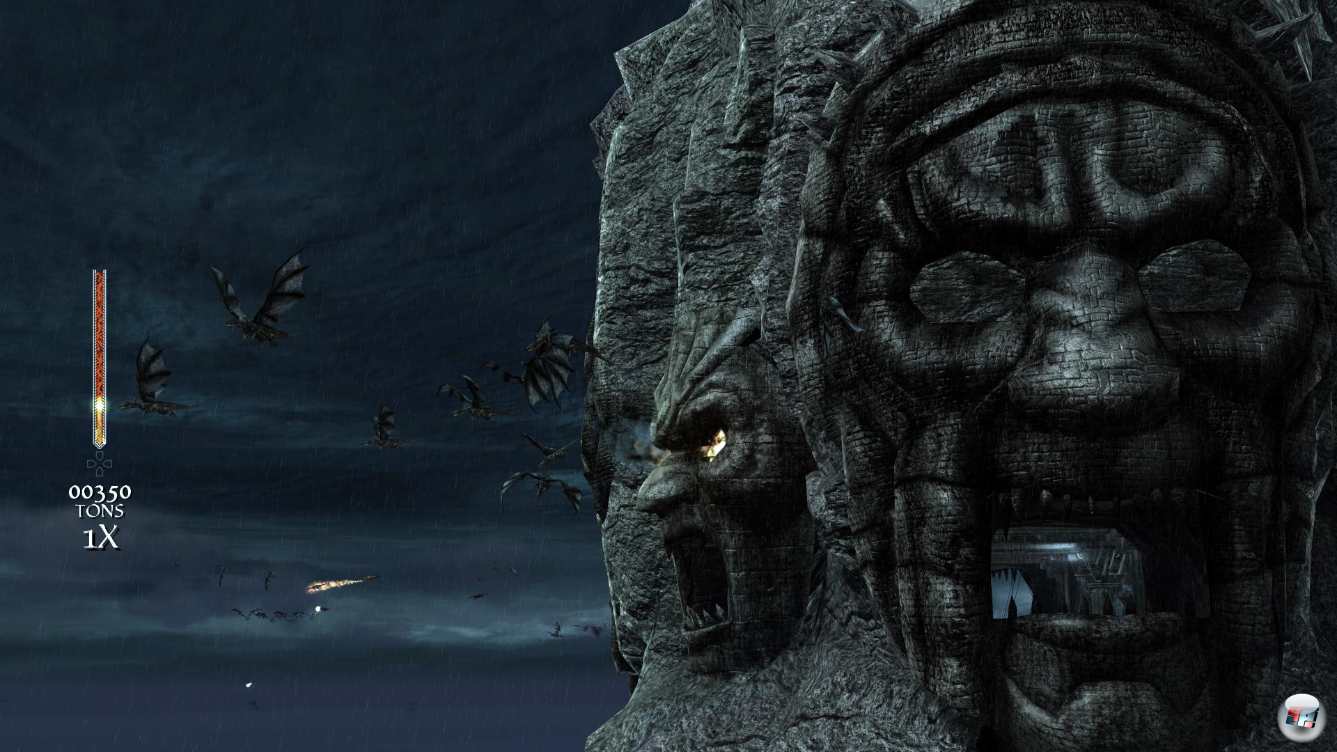 Einer der besseren Aufträge: Ihr müsst die Abwehrgeschütze in Form leuchtender Augen ausschalten und dann in die riesigen Mäuler fliegen, um im Inneren der Festung weiter zu kämpfen.