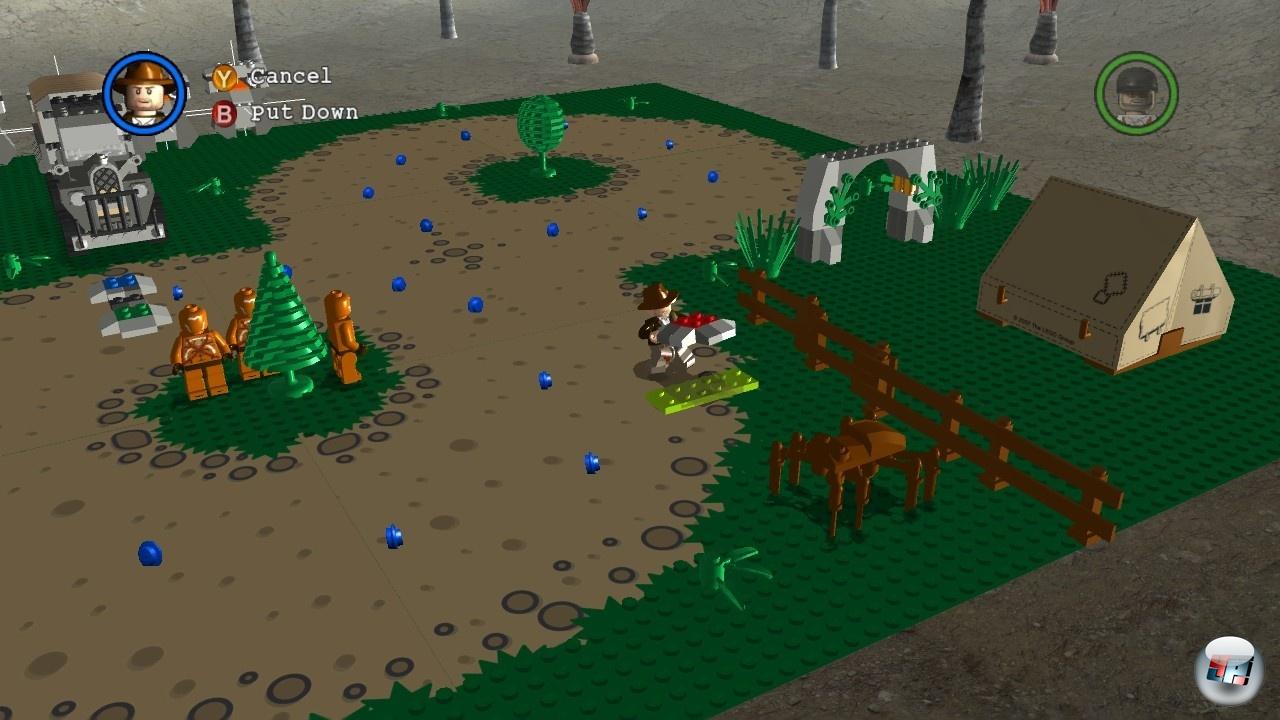 Das Konzept Lego dreht sich in erster Linie um das Bauen, und dennoch hatte man in keinem Teil der Serie die Möglichkeit, selbst etwas zu erstellen, was nicht von den Entwicklern so gedacht war. Das ändert sich mit Indy 2, denn neben dem eigentlichen Spiel ist auch ein ausgewachsener Welteneditor an Bord. »Welten« ist schon bewusst gewählt, denn man kann nicht nur eigene Levels, sondern auch komplette kleine Abenteuer damit kreieren! Die Bedienung wirkt anfangs etwas konfus: Unterschiedliche Baumeister stehen für unterschiedliche Aufgaben: Das Alien kann mit seinem UFO frei nach Populous die