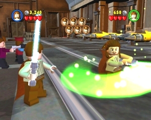 Dabei solltet ihr stets die Augen nach kleinen Bausteinen offen halten, die einfach überall versteckt sind. Die benutzt ihr zwischen den Levels, um neue Figuren, Spieltipps oder sonstige Extras freizuschalten. Darüber hinaus füllen sie euren Jedi-Meter auf, der nochmals für Boni sorgt. Die kleinen Stein erhaltet ihr hauptsächlich durch Machtgebrauch: Wie jeder gute Jedi könnt ihr per Handgefuchtel Schalter umlegen, Gegner wegstoßen oder Maschinen bedienen – wobei bei solchen Aktionen oft genug erwähnten Bausteinchen rausspringen, im wahrsten Sinne des Wortes. Wichtig ist außerdem noch, dass ihr spezielle zerstörte Dinge wieder zusammensetzen, und Kisten von einem Platz zum anderen schweben lassen könnt. So könnt ihr euch Brücken und Treppen bauen, die nicht nur dem Levelfortschritt sondern meist auch der Boni-Suche dienen. Forscher-Naturen werden in LEGO Star Wars also mehr als gefordert. Die Benutzung der Macht ist sehr einfach gehalten: Alles was beeinflusst werden kann, leuchtet beim Vorüberlaufen dezent auf. So lädt das Game ständig zum Ausprobieren und Experimentieren ein, was einen großen Teil der Faszination ausmacht.
