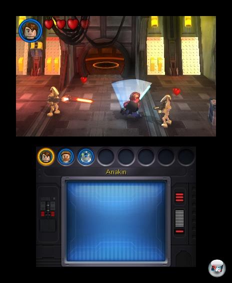 Wie auch in den großen Versionen ist man fast immer in der Gruppe unterwegs. Per Druck auf den Touchscreen oder die Schultertasten wechselt man zwischen den Figuren, die unterschiedliche Eigenschaften vorweisen: Während Jedi z.B. mittels der Macht auch Gegenstände schweben lassen können, haben Klontruppler die Möglichkeit, Objekte zu sprengen oder per Greifhaken an Wänden herumzuklettern. Neben den Landmissionen findet man sich hin und wieder auch am Steuer eines Raumflitzers wieder, um mittels Lasersalven und violett glühenden Torpedos für Schrecken unter den Separatisten zu sorgen. Diese Ausflüge sehen prima aus und sorgen gerade im 3D-Modus für ein cooles Mittendrin-Gefühl.