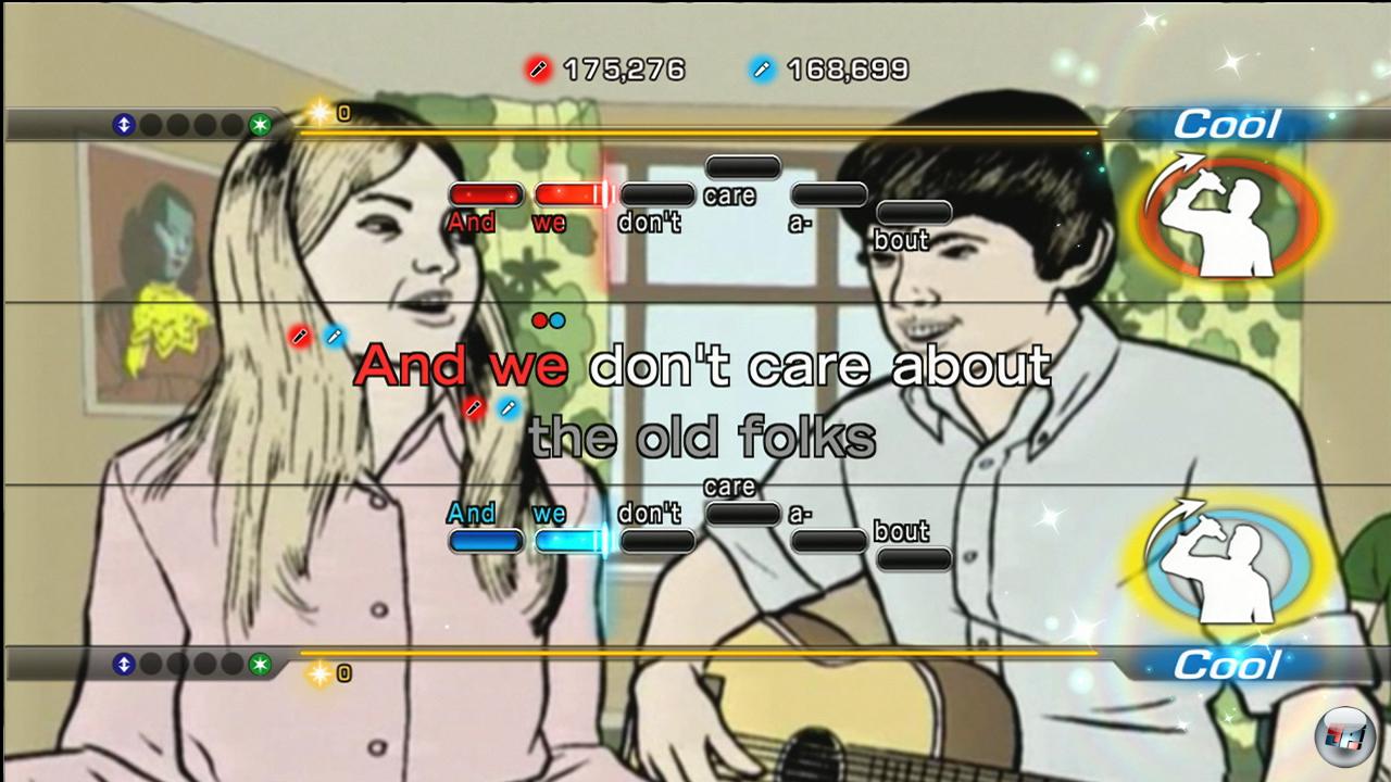Bewegungen zu imitieren und dadurch eine Art Starpower zu aktivieren, mit der ihr mehr Punkte sammeln könnt. Was sich in der Theorie noch wie eine potenzielle Bereicherung des Spielablaufs anhört, erweist sich in der Praxis allerdings zu oft als überflüssiger Unsinn. Dabei liegt es gar nicht mal an der Erfassung der Bewegungen, was überwiegend gut funktioniert. Müsst ihr das Mikro auch nur lässig über dem Kopf nach unten halten und posieren, ist auch noch alles in Ordnung. Sobald es aber darum geht, mit ihnen Luftgitarre zu spielen oder sie einmal hinter dem Rücken vorbei zu führen, wird es sinnfrei. Nein, nicht weil es albern aussieht – das passt ja auch zu einer ausgelassenen Karaoke-Party. Aber da ihr die Bewegungen meist dann ausführen müsst, während ihr gleichzeitig noch den Text ins Mikro trällern müsst, sind viele der geforderten Verrenkungen absolut fehl am Platze. Da nützt auch der schönste Bonus nichts, wenn man den Gesang erst unterbrechen muss, um ihn zu aktivieren. Daneben könnt ihr die Mikros auch dazu benutzen, mit einer Schlagbewegung diverse Instrumente wie z.B. ein Tamburin oder eine Rassel zu imitieren, wodurch ein entsprechender Soundeffekt im Hintergrund erklingt. Dumm nur, dass dies mit einer merklichen Verzögerung passiert und ihr so den Eindruck vermittelt, nicht im Takt zu schlagen. Alternativ könnt ihr aber auch auf den Knöpfen des Controllers rumhacken und euch sogar selbst Applaus spenden – oder ihr reicht das Pad an die Leute weiter, die gerade nicht mitsingen können, aber trotzdem irgendeine Beschäftigung brauchen. Die Idee an sich ist nett, aber die Umsetzung lässt zu wünschen übrig.