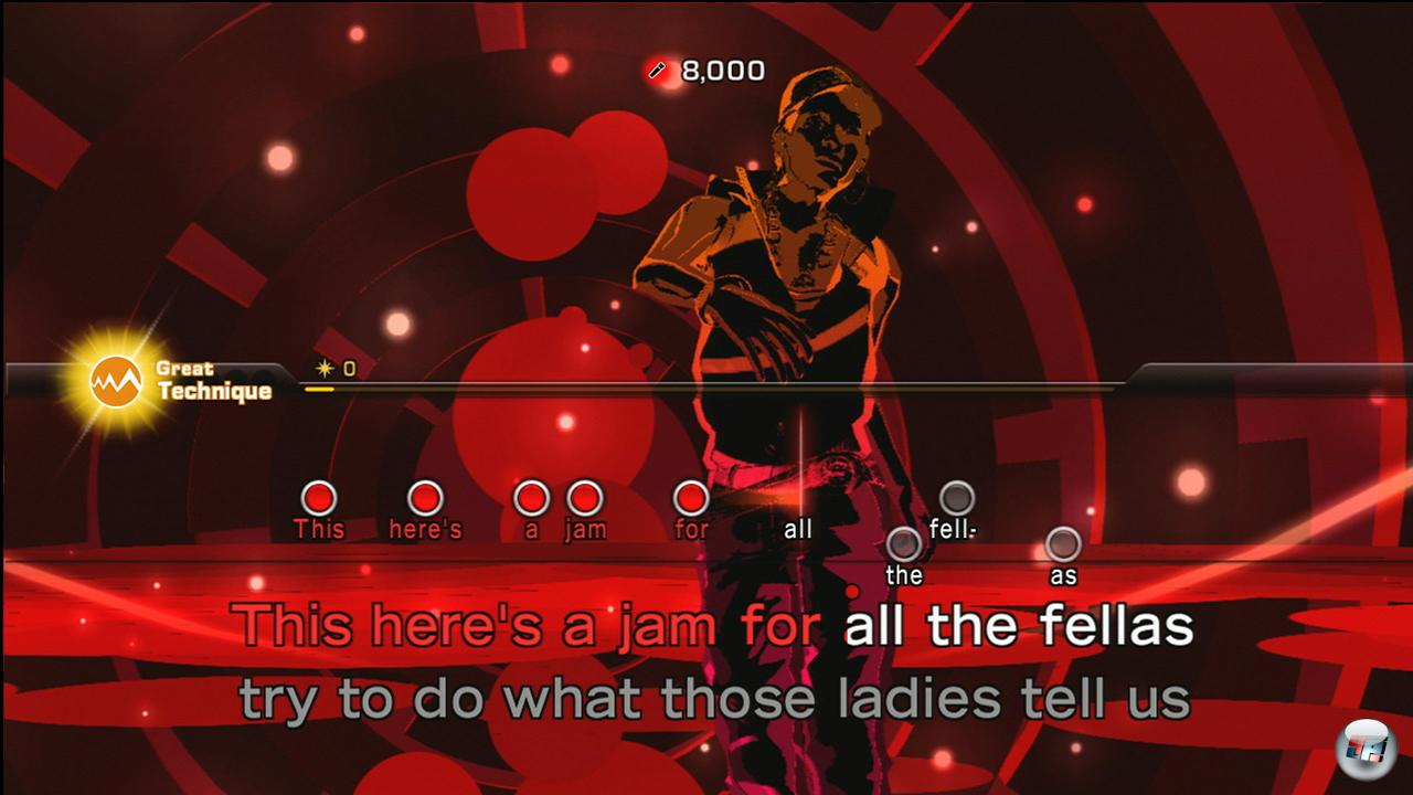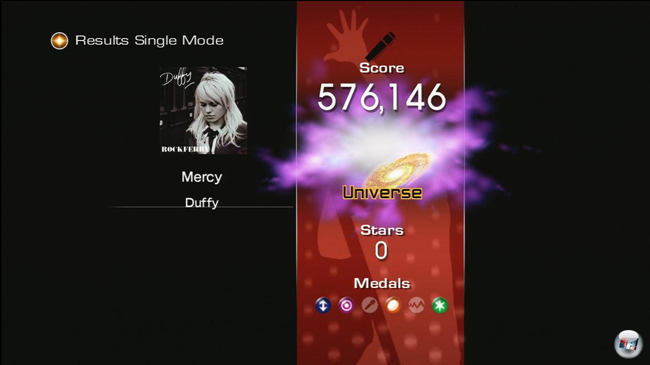 Auch wenn die Software bei einigen schiefen Tönen die Augen zudrückt, funktioniert die Erkennung insgesamt recht gut. Im Gegensatz zu SingStar spielen bei Lips nicht nur Tonhöhe und Rhythmus, sondern auch der Text an sich eine Rolle – mit bloßem Summen lässt sich hier also keine so hohe Punktzahl erreichen wie beim korrekten Singen der Wörter. Zusätzlich wirken sich auch stimmliche Leistungen wie Vibrato auf die Bewertung aus, doch habe ich mich manchmal gefragt, warum ich diesen Bonus in manchen Passagen bekommen habe, die ich garantiert „Vibrato-frei“ vorgetragen habe. Eine schöne Sache ist das Medaillen-System: Neben den Punkten für das Singen und die „Sternenstrahl“-Sequenzen, dürft ihr euch bei jedem Song bis zu sechs Sonderauszeichnungen erarbeiten, die für eine gute Tonlage, Stabilität, Rhythmusgefühl, Gesangstechnik und die Performance mit den Mikros verliehen werden. Machen auch die anderen fleißig mit und drücken rhythmisch die Controller-Tasten, dürft ihr euch sogar über eine Party-Medaille freuen. Spielt ihr alleine, steigt ihr mit konstanten Leistungen im Rangsystem auf und werdet vom Kneipensänger zum gefeierten Superstar. Allerdings ist es schade, dass man hier im Gegensatz zu SingStar nur beim kooperativen Singen unterschiedliche Rollen eines Gesangs-Duos übernehmen darf (wie z.B. bei Rihannas „Umbrella“ zusammen mit Jay Z.) und ein Harmonie-Modus für echtes zweistimmiges Singen nicht existiert. Zudem ist man bei Sony beim Erfassen von Rap-Sequenzen deutlich weiter, da bei Lips die Tonlage anscheinend gar keine Rolle spielt und man so jede Silbe locker trifft.