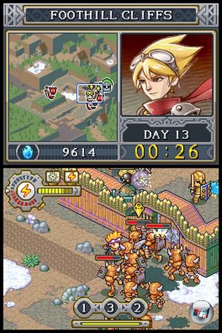 Das gilt auch für die Kampfphase, in der ihr prinzipiell nur den gewünschten Gegner antippen müsst, damit der junge Archineur selbstständig attackiert. Sehr bald ist der Bildschirm jedoch überfüllt mit roten Symbolen und ihr müsst ausgiebigen Gebrauch von Reaktionsspielen machen, mit denen Lock besonders starke Angriffe ausführt. Auch von diesen stehen ihm bald mehrere zur Verfügung, zwischen denen er jederzeit wechseln kann. Hat Lock ausreichend Uhrwerker verschrottet, darf er die Gegner außerdem mit einem Spezialangriff stark beschädigen, verlangsamen oder er repariert in Windeseile seine Befestigungen – wobei ihm auch dies über ein erfolgreiches Reaktionsspiel schneller gelingt. Neben Geld hinterlassen die bösen Roboter außerdem gelegentlich Schrotteile, aus denen ihr während der Bauphase neue Fallen oder Geschütztürme zusammensetzt.