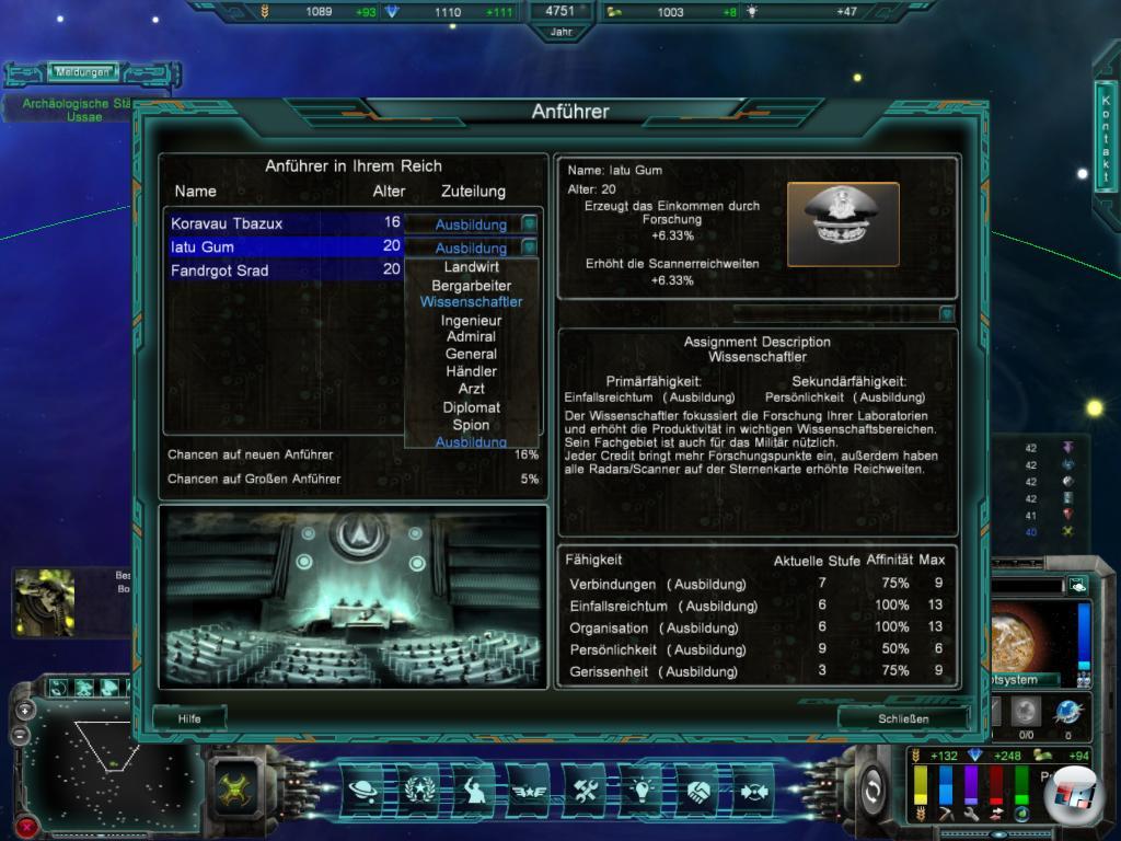 Neu ist das Prinzip der Anführer, die ihr dieses Mal nicht einzelnen Planeten, Armeen oder Flotten zuteilt, sondern die globale Vorteile bringen. Wenn ihr einen Arzt einstellt, dann vermehrt sich eure Bevölkerung im ganzen Reich schneller. Ein Bergmann bringt euch pro Runde mehr Erze, ein General verbessert die Verteidigung und ein Diplomat die Beziehung zu den anderen. In eurem Anführermenü habt immer eine Anzahl von Anführen, denen ihr Aufgaben zuteilen könnt. Sie werden älter, erfahrener und sterben irgendwann. Bisweilen erscheinen neue, so dass ihr immer einige in petto habt. Man könnte sie als lebende Joker sehen, da sie Defizite ausgleichen. Habt ihr eine schlechte Handelsbilanz, kann ein Händler aus den roten Zahlen helfen.