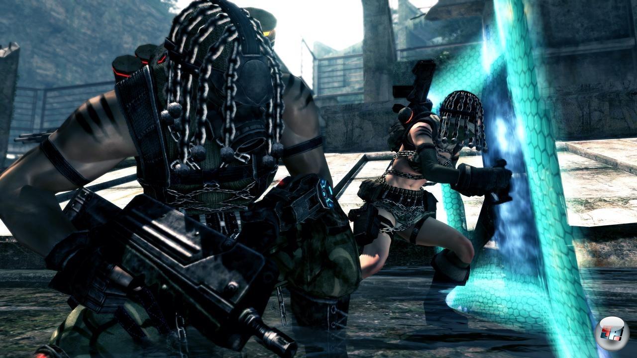 Es gibt zig Individualisierungen, so dass man sich auf lange Sicht einen Kämpfer nach Wahl schaffen kann – selbst fettleibige Chaoten in Knallrot sind möglich. Interessanter als dieser Karneval ist da schon das Fähigkeitensystem: Man kann seinen Charakter mit bis zu zwei Eigenschaften etwas aufwerten – das kann mehr Sprengkraft für die Granaten, eine höhere kritische Trefferchance oder Ähnliches sein. Auch Statistikfreunde kommen auf ihre Kosten: Capcom zeichnet quasi alles auf, was man wo erreicht und führt Buch über alle explosiven Aktivitäten. Außerdem kann man prominente Charaktere wie Wesker (Resident Evil) oder Frank West (Dead Rising) freischalten sowie auf der Xbox 360 noch die Muskelberge aus Gears of War. Und wer nach Multiplayer-Herausforderungen sucht, kann sich abseits der gewöhnlichen Deathmatch- und Gebietseroberungs-Modi an wöchentlichen Kämpfen für eine von fünf Fraktion versuchen – darunter auch eine komplett weiblich modellierte. Bis zu 16 Spieler legen hier in allen Waffensystemen los. Aber warum heißen die Fraktionen eigentlich „Faktionen“?