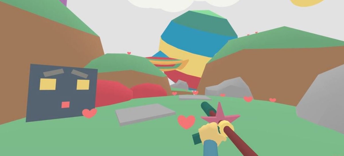 Auf eine umrahmende Erzählung, die einen eventuell zwischendurch zur Ruhe kommen lassen könnte, wird hier verzichtet. Und die mich immer wieder positiv an die Katamari-Serie erinnernde audiovisuelle Gestaltung trägt ebenfalls dazu bei, die Hektik und den Stress zu erhöhen. Die schrecklich fröhliche Musik z.B. wird in einem Dauerloop heruntergedudelt und wechselt nur beim Betreten einer neuen Welt. Und die in Pastellfarben gehaltene, auf klar definierte Strukturen reduzierte, abstrakte Welt, durch die man schießen und hüpfend rennt, hätte eigentlich das Zeug dazu, einen „runterkommen“ zu lassen: Neben den Gefahren kann man immer und überall z.B. niedliche Herzchen entdecken. Doch während ich irgendwann aufgehört habe, mich darüber zu wundern, dass auf dem liebenswerten Planet ein kantiger Wasserball die Sonne ersetzt, zumal es hier ohnehin keine Schatten gibt, flüstert mir die Kulisse immer wieder ins Ohr: „Stell keine Fragen. Lauf einfach. Und scheitere!“ Gesagt. Getan.