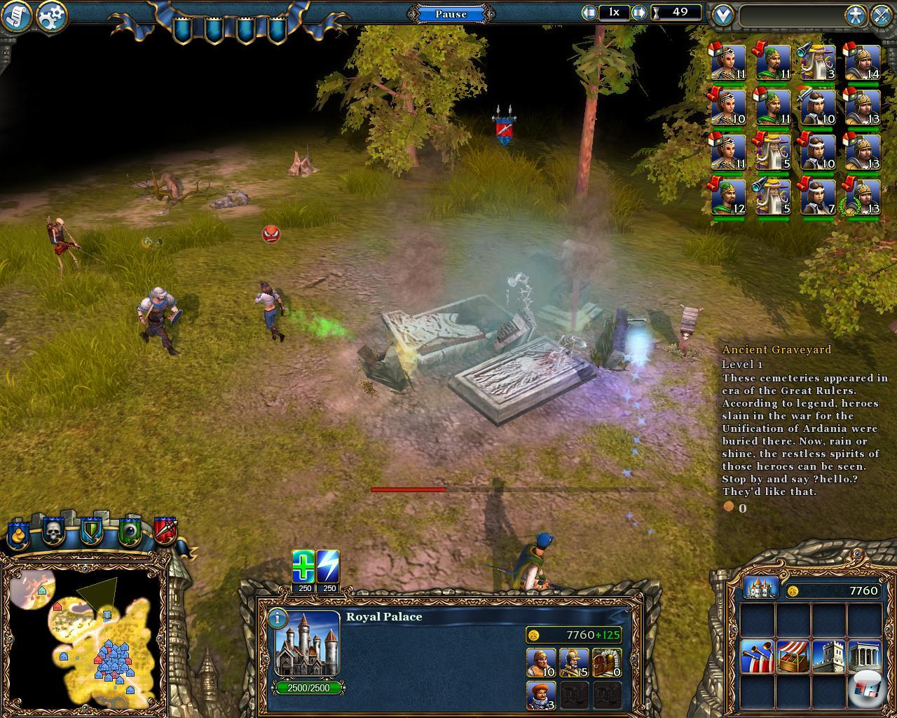 Höhe der Belohnung fest, schon setzten sie sich brav in Bewegung. Wie viele Helden sich für das anvisierte Ziel interessieren, lässt sich stets ablesen. Aber leider nicht, welche genau es sind. Interessieren sich fünf, sechs Leute für eine Höhle, dann reicht das meist, um zu siegen. Vorausgesetzt, man hat Heiltränke, die automatisch eingenommen werden. Denn in der Höhle sind jetzt auch Monster, die am Schluss rauskommen und angreifen. So muss man aufpassen, dass die Gruppe stark genug ist, denn am Ende muss sie noch ein paar Gegner plätten. Als König kann man dann mit Heilzaubern eingreifen, was eine der raren Möglichkeit ist, direkt am Geschehen teilzunehmen.