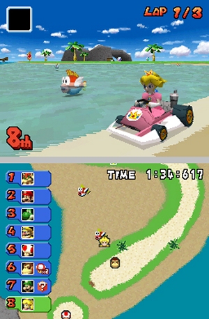 Das erste Mal in seiner Geschichte verfügt ein Mario Kart über zwei Bildschirme. Was tun mit all dem Segen? Eine übersichtliche Karte muss her! Oder besser gleich zwei, zwischen denen man umschalten kann: Die eine zeigt einen Teil der Strecke aus der Vogelperspektiven und scrollt fleißig mit dem Spieler mit – prinzipiell also nur eine andere Ansicht als die 3D-Perspektive auf dem oberen Screen. Das hat aber einige Vorteile: Zum einen sieht man alle Gegner, Hindernisse und abgefeuerten Waffen; außerdem erkennt man, welches Item die Konkurrenten gerade haben – kann sich also perfekt auf künftige Gefahren einstellen. Zum anderen kann man, wenn einem z.B. durch den Tintenfisch ein großer Teil der Sicht zugekleckst ist, den Blick nach unten wenden und die Strecke sicher weiterfahren. Eine Vereinfachung also, weswegen Oldschool-Spieler auf den Touchscreen drücken