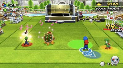 Im Menü wartet z.B. Volleyball auf Peach, Bowser & Co – alle haben bestimmte sportive Merkmale wie Allrounder oder Kraftpaket, man kann aber auch mit eigenen Miis loslegen. Obwohl die in allen Disziplinen nahezu identische Steuerung, wahlweise Remote quer oder Nunchuk und Remote, das ganze Repertoire von Pritschen, Schmettern und Blocken anbietet, will in der Mario-Arena keine Begeisterung aufkommen. Warum nicht? Zu simpel ist das Teamspiel gestrickt, zu fade wirkt die Mii-Kulisse und zu träge agiert die KI. Was der Technik an Texturdetails fehlt, können die acht freischaltbaren Arenen immerhin mit Fallen, Hindernissen, Monstern und Fontänen wett machen: Bunt und bewegt konnte Nintendo schon immer.