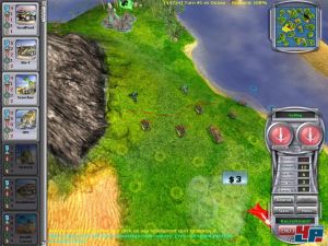 Hört sich einfach an, ist aber schwierig zu bewerkstelligen, da der Gegner natürlich mit allem, was er hat, dagegen hält. Es gibt zwei Parteien, die man am besten mit GDI und NOD aus der Command & Conquer-Reihe vergleichen könnte. Sie verfügen allerdings über ein fast identisches Waffenarsenal, das aus 26 teils futuristische 3D-Einheiten besteht, was recht wenig ist. Es gibt Spähfahrzeuge, Panzer, Artillerie, Raketenwerfer, Transporter, Kampfroboter, Türme und Flugzeuge. Sie besitzen Eigenschaften wie Bewegung, Panzerung, Feuerkraft und Reichweite und kosten unterschiedlich. Mit Amphibienfahrzeugen könnt ihr auch Landeoperationen übers Meer riskieren, die von Kampfschiffen begleitet werden.