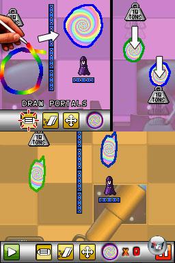 In einem alternativen Modus platziert ihr die bereits erwähnten Portale auf den Bildschirm, welche jedes bewegliche Objekt verschlucken und an eine andere Stelle befördern. Außerdem zeichnet ihr wie in Kirbys Power-Malpinsel Plattformen direkt mit dem Stylus, damit z.B. der humanoide Einrad-Roboter darüber an sein Ziel knattert. Für Übersicht sorgt die herausgezoomte Karte auf dem oberen Bildschirm. Die Kamera bewegt ihr mit dem Steuerkreuz. Gleichzeitig bedient ihr alles andere bequem mit dem Stylus. Auch der Baukasten ist ähnlich einfach zu bedienen. Ein Tutorial hätte allerdings nicht geschadet, denn manche Feinheiten findet ihr erst nach ein wenig Herumprobieren heraus – oder durch unser kleines Tutorial im 4P-Spieletipps-Bereich. Eure eigens entworfenen Maschinen dürft ihr übrigens mit Freunden tauschen – allerdings nur lokal und nicht per Internet-Verbindung.