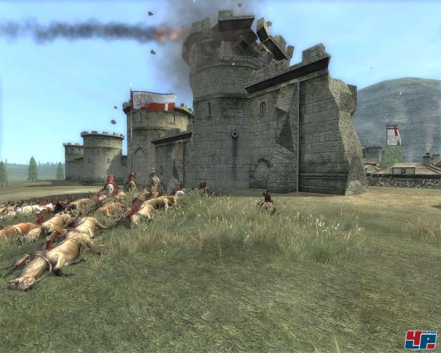 Auch bei den Belagerungen wirken die Gegenmaßnahmen nicht immer durchdacht: Man kann mit seinem Rammbock oft ohne feindliche Ausfälle die Tore einreißen – das ist etwas zu einfach. Und vielleicht könnte man in späteren Spielen programmieren, dass die Männer auf den Brustwehren die Eingänge schützen. Allerdings funktioniert das schnelle Erobern vornehmlich dann, wenn man vor den Mauern eine große Übermacht hat. Ob das damit zusammen hängt? Allerdings gibt es auch Gegenbeispiele: Mein Rammbock wurde schon mal von den Mauern aus mit Brandpfeilen so lange bespickt, bis er in sich zusammen brach und ich die Stürmung abbrechen musste. Wesentlich effektiver sind natürlich die Ballisten, Triboks und Kanonen in diversen Kalibern, die diesmal sogar ganze Gebäude authentisch einreißen können – je nachdem, wo ihr trefft, bricht das Gemäuer in sich zusammen.