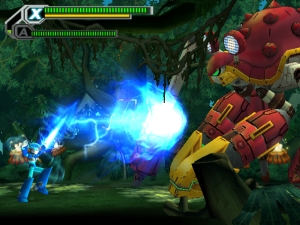 Spielerische Revolutionen solltet ihr besser nicht erwarten, X8 bleibt der über die Jahre gereiften Serientradition treu: D.h. ihr rennt durch größtenteils seitwärts scrollende Levels, ballert skurrile Gegner ab und gebt den nochmals abgefahreneren Bossgegnern ordentlich Saures. Die kaum erwähnenswerte Story dreht sich wie immer um das ewige Hin und Her zwischen guten und bösen Robotern, was in zwar ansehnlichen, aber etwas grobkörnigen Anime-Filmchen präsentiert wird. Die erste der zehn Missionen ist ein langes Tutorial, in dem ihr mit den Besonderheiten des Spiels vertraut gemacht werdet: Da wäre z.B., dass ihr stets mit zwei von drei Helden unterwegs seid. X, der typische Blauling, kann einen aufladbaren Superschuss abfeuern. Heißblut Axl darf kurz schweben und dauerfeuern, außerdem verleibt er sich DNS-Schnipsel gefallener Gegner ein, um sich anschließend einige ihrer Eigenschaften anzueignen. Der letzte im Bunde ist Zero: dieser sprungfreudige Bursche ist nur erfahrenen Megaman-Spielern zu empfehlen, verlässt er sich doch auf zwar auf sein cool aussehendes, aber gerade in Bosskämpfen nachteiliges Lichtschwert. Ihr könnt jederzeit zwischen den beiden Robotern wechseln, außerdem sind in speziellen Momenten Teamaktionen möglich – welche im coolen