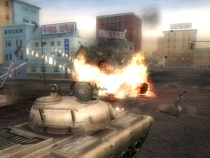 Das Geld investiert ihr in neue Waffen oder bessere Ausrüstung. Besonders wichtig wird schon nach kurzer Spielzeit »Merchant of Menace« – die offizielle Homepage der Russenmafia. Dort bekommt ihr nützliche Spezialwummen und mächtige Artillerieschläge – doch dazu gleich mehr. Ihr dürft zwar nur zwei Hauptwaffen nebst Granaten und etwas Zusatzausrüstung wie C4 mit euch herumtragen, allerdings könnt ihr die Knarren jederzeit gegen Waffen von gefallenen Gegnern eintauschen. Und da die Wege zwischen zwei Zielen teilweise sehr groß sind, könnt ihr jedes Vehikel benutzen: Ob Jeep, Truppentransporter, ziviles Fahrzeug oder Helikopter – das Beschlagnahmen funktioniert so einfach wie in der GTA-Serie. Manche Fahrzeuge haben auch Platz für mehrere Personen, so dass euch auf ein Hupzeichen befreundete Soldaten gerne Gesellschaft leisten und z.B. das montierte Gewehr besetzen. Die Steuerung der Vehikel ist von Typ zu Typ unterschiedlich einfach; ein flitziger Jeep lässt sich wesentlicher besser kontrollieren als ein behäbiger Panzer. Außerhalb der Fahrzeuge müsst ihr euch erst an das volle Pad gewöhnen, aber dank intelligenter Zielhilfen geht auch hier das Gegner-Zermürben lockern von der Hand. Etwas ärgerlich ist, dass ihr inmitten von Scharmützeln immer wieder mal auch eigene Truppen oder Zivilisten trefft – was natürlich mit einem »Kollateralschaden«-Abzug bestraft wird.