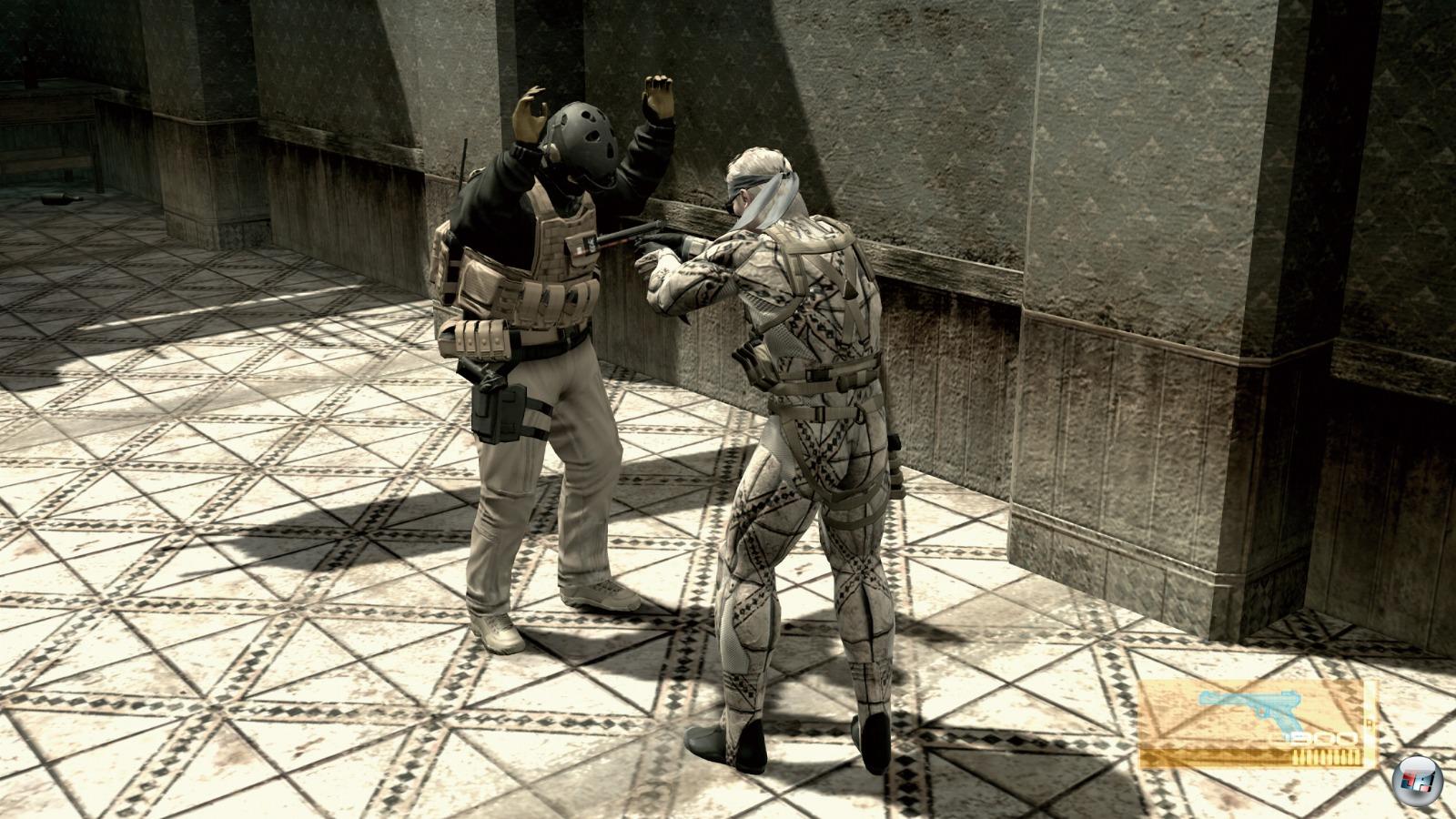| CQC in Aktion: Ihr könnt Feinde elegant ausknocken, entwaffnen oder bedrohen, um sie dann nach Gegenständen zu untersuchen. |