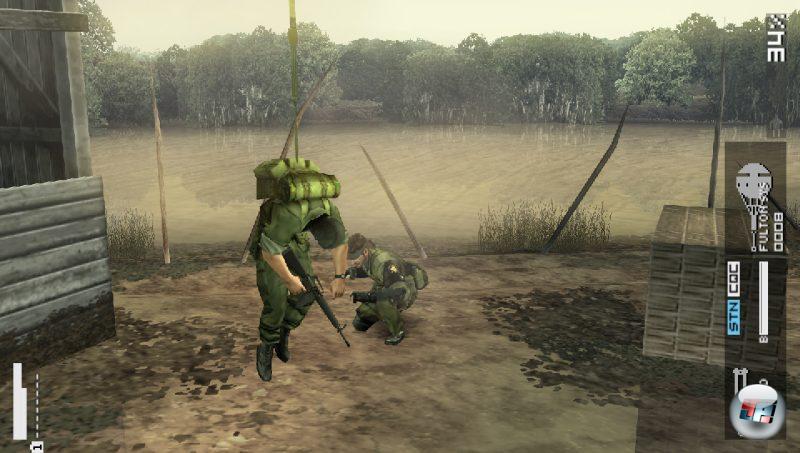 Wer die Metal Gear-Serie ein bisschen kennt, wird bereits ahnen, dass mehr dahinter steckt. Ohne viel zu verraten stehen auch hier bald die atomare Bedrohung als ultimative Abschreckung sowie die Entwicklung einer neuartigen Mech-Waffe im Mittelpunkt, deren Pläne bereits in Metal Gear Solid: Snake Eater auftauchten. Überhaupt greift der PSP-Titel einige Erzählstränge des letzten PS2-Einsatzes auf und kann deshalb als inhaltliche Fortsetzung betrachtet werden. So geht man auch bei den Schauplätzen ähnliche Wege, denn nach kurzen Abstechern in Basen oder an den Strand ist man den Großteil der Spielzeit im Dschungel unterwegs. Im Gegensatz zu Snake Eater kann man die Uniform allerdings nicht mehr nach Belieben wechseln, sondern muss sich vor der Mission auf ein Outfit festlegen. Ist die Auswahl zu Beginn noch sehr beschränkt, schaltet man im Lauf der Zeit weitere Uniformen frei, die alle einen individuellen Tarn-Index für die Bereiche Sand, Beton, Dschungel, Sumpf, Baum, Erde, Fels und Ruinen aufweisen. Um die zeitaufwändige Verpflegung und manuelle Verarztung von Snake muss man sich hier zum Glück nicht mehr kümmern. Die Verstandsanzeige gilt es neben der Gesundheit aber weiterhin im Auge zu behalten, auch wenn negative Einflüsse zumindest mit der automatischen Zielhilfe kaum spürbar sind. Ohne die Unterstützung neigt Snake dazu, beim Zielen zu zittern, was besonders