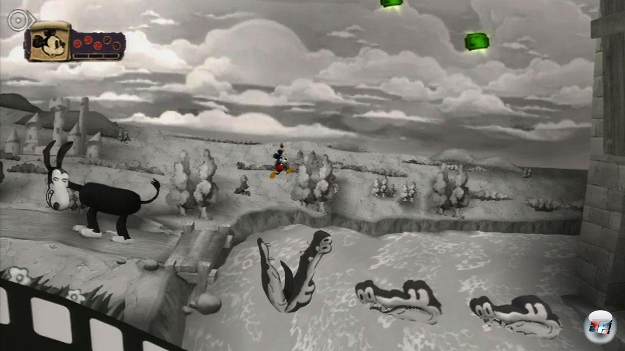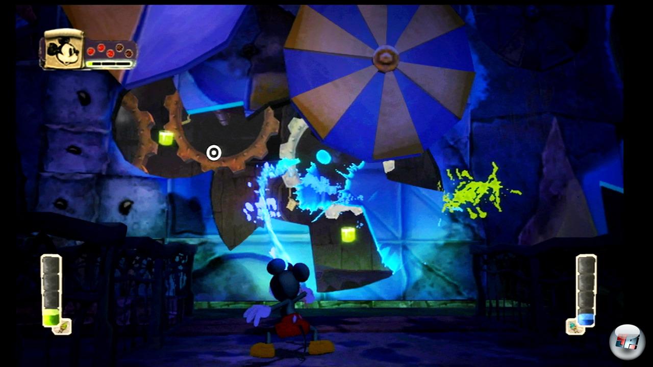 Micky hat zwei Möglichkeiten: Er kann auch die letzte Farbe wegwischen oder er stellt zumindest einen Großteil der Fassaden wieder her. Man zielt einfach mit der Remote auf den Bildschirm und spritzt Verdünner oder Farbe. Es ist unglaublich faszinierend, die Umgebung zu gestalten! Ein Knopfdruck hier und das Haus bekommt einen ganz neuen Anstrich. Einen Knopfdruck da und unter dem ausradierten Rasen kommt ein geheimer Tunnel zum Vorschein. Es ist vor allem die Mischung aus kreativem Klecksen und dem Entdecken von Geheimnissen, die Farbe und Verdünner mit zu den wichtigsten virtuellen Werkzeugen dieses Spielejahres machen: Man baut sich selber Plattformen und Wege, anstatt auf vorgegebenen Pfaden zu trotten –