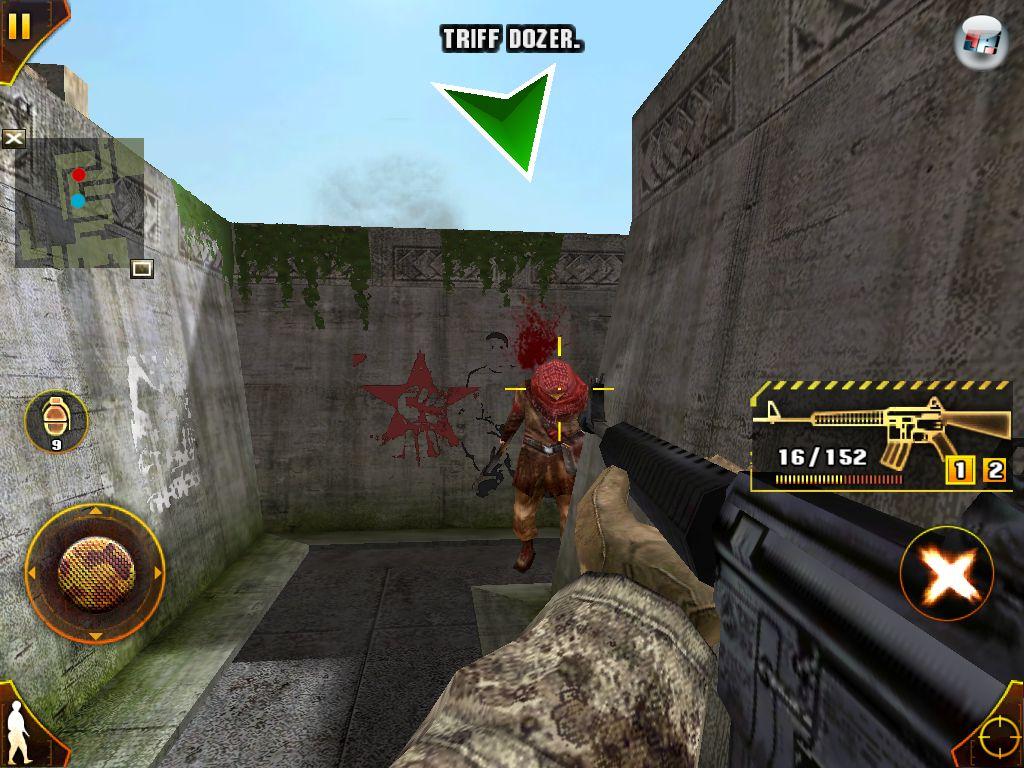 aus der Schultersicht durch die Schlacht zu navigieren, schaue ich direkt durch die Augen meines Kriegers – ganz wie im Vorbild Modern Warfare. Ein Deckungssystem gibt es nicht. Davon abgesehen wird aber gesteuert wie gehabt: Der eigene Soldat wird mittels virtuellem Analogstick in der linken unteren Bildecke übers Schlachtfeld gescheucht; die Kamera bewegt man, indem man mit dem rechten Daumen an irgendeiner Stelle über den Touchscreen streicht. Auch nach ein wenig Feintuning geht die Steuerung aber nicht so intuitiv von der Hand wie im an Halo angelehnten