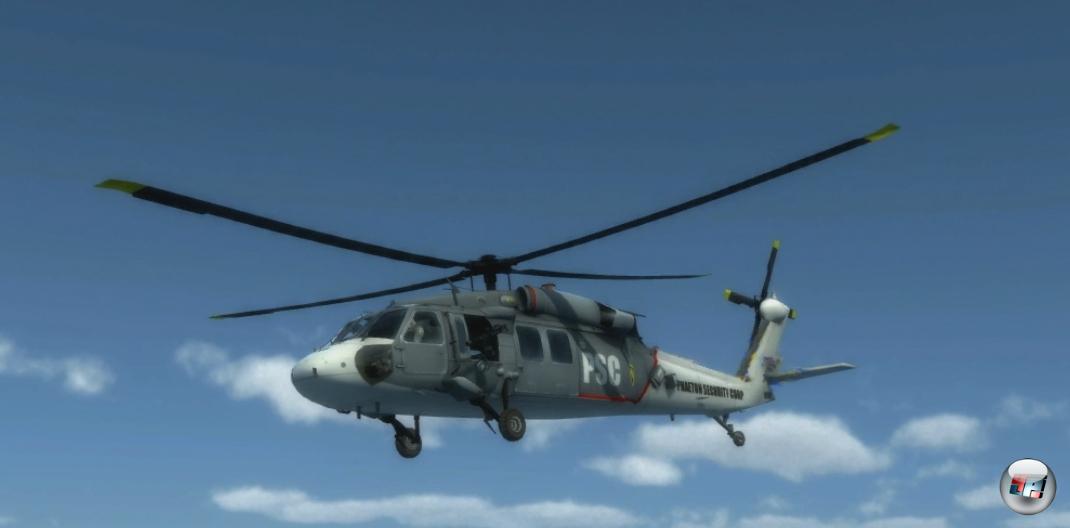 Nach kurzer Ladezeit sehe ich einen Hubschrauber über ein anständig animiertes Meer sausen, die Kamera schwenkt in die Verfolgerperspektive.