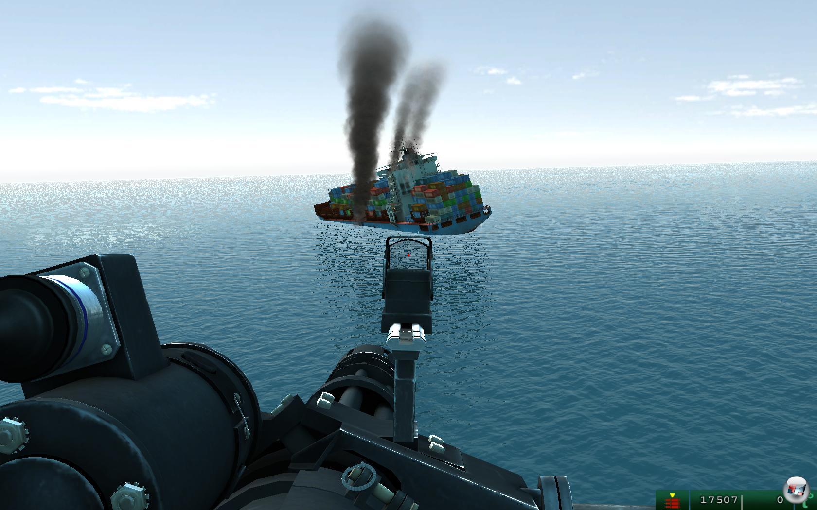 Gesagt, getan und schwupps befinde ich mich an der seitlich montierten Mini-Gun, mit der ich die linke Seite des Helis abdecken kann. Das Fadenkreuz lässt sich per Maus frei bewegen und eine einfache Zoomstufe gibt es auch. Nach einiger Zeit tauchen in der Ferne auch schon die ersten Piraten auf. Doch wer gut ausgerüstete Gegner erwarten haben sollte, wird herbe enttäuscht: Auf einmotorigen Nussschalen, die an die Flüchlingsboote vor Lampedusa erinnern, schippert jeweils eine Hand voll Piraten pro Boot in Richtung Containerriese. Es ist mir ein Rätsel, was die Brüder an den turmhohen Seitenwänden des Frachters überhaupt anrichten wollen, aber ich eröffne trotzdem brav das Feuer.