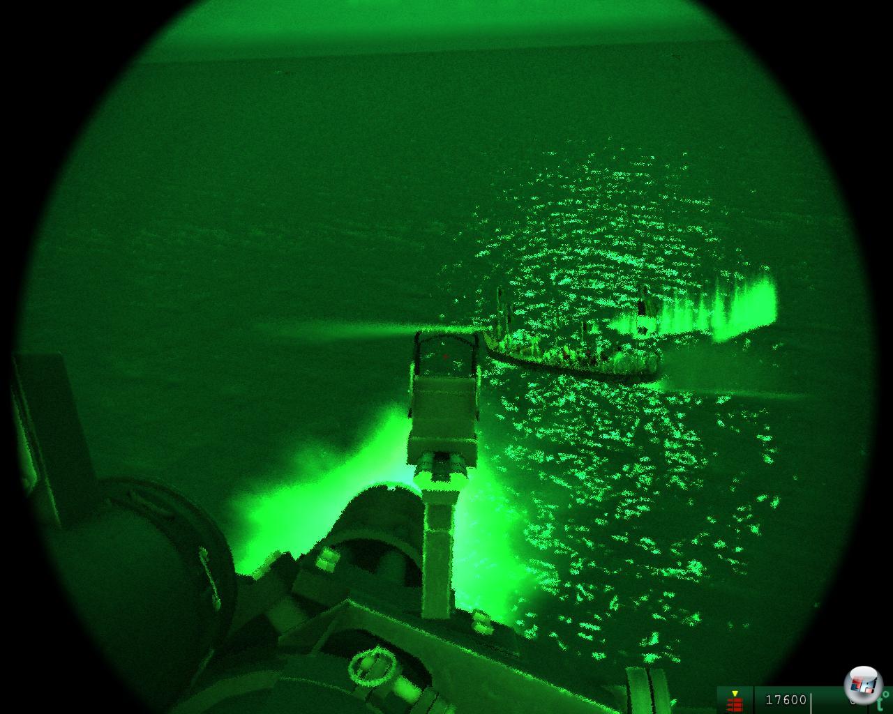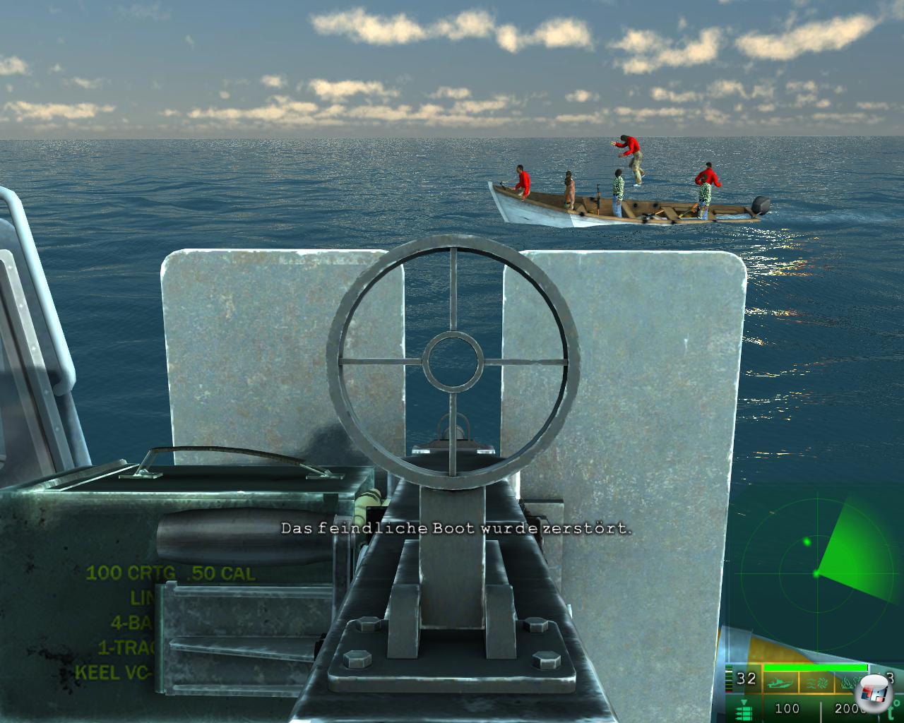 Mit einem dünnen „Brrrrrrat“ spuckt meine MG Blei auf die bedauernswerten Somalis, die dem nicht viel entgegenzusetzen haben, außer ein paar Schüssen aus ihren AK 47. Die prallen aber eher harmlos von mir und meinem Hubschrauber (den ich übrigens nie steuere) ab. Nach ein paar Treffern auf die Schaluppe, geht auch schon der (einzige) Motor hoch, die armen Brüder hüpfen ins Wasser und schwimmen in den Tod&denn Rettungsboote darf man auf einem Schiffchen das selbst nur den Maßen eines Rettungsbootes entspricht, wohl kaum erwarten. Die anschließende „Alle Mann von Bord“-Animation gab es so übrigens schon eins zu eins in PT Boats. Soviel zu den etwa fünf Hubschraubereinsätzen der insgesamt dreizehn Missionen, denn die übrigen gleichen dieser ersten wie ein Somali-Boot dem anderen. Mit einer Ausnahme: Genau eine Nachtmission hat es ins Spiel geschafft und die sieht sogar sehr gut aus: Da bricht der Mond durch die Wolken und wirft sein funkelndes Licht auf den Ozean, man möchte den Begriff „beeindruckend“ verwenden, wenn da nicht wieder Unzulänglichkeiten das Bild trüben würden. Ich kann in der Mission zwar ein Nachtsichtgerät einschalten, welches das Szenario dann in das klassische grüne Licht taucht, aber warum kann nicht ein einziger Scheinwerfer genutzt werden? So hätte ich zumindest mal was anderes zu tun, als immer nur stupide zu ballern, bis der Lauf schmilzt. Mir ist zugetragen worden, dass moderne Hubschrauber über so etwas verfügen. Immerhin: Wenn mal nichts zu tun ist, kann ich die Spielgeschwindigkeit verdoppeln oder vervierfachen.