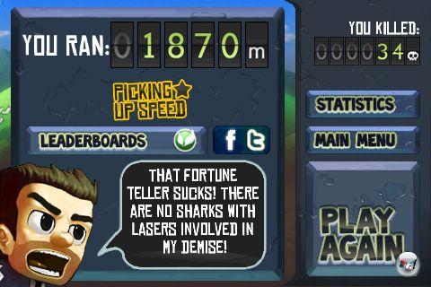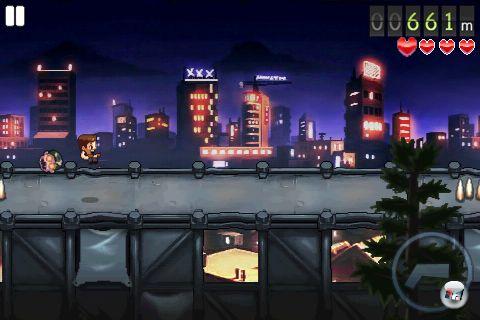 Im Wesentlichen war’s das schon – wer am Weitesten läuft, kann per Open-Feint-Unterstützung in der Rangliste damit angeben. Alle tausend Meter beamt Barry sich in ein neues der schlicht gestalteten 2D-Areale: Mal sprintet er des nachts vor einem transsylvanischen Schloss entlang, später ballert er sich durch eine von Zombies heimgesuchte Metropole. Neben Energie spendenden Herzchen warten eine Hand voll Extrawummen auf ihren Einsatz.