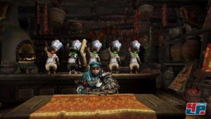 Leider hat Capcom das Konzept nicht zu Ende gedacht, denn wegen der preiswerten Angebote beim Warenhändler gibt es eigentlich keinen zwingenden Grund, mit dem Erweitern des Grundstücks Zeit zu verschwenden. Schade, ich hätte mich viel stärker mit meiner Heldin identifiziert, wenn mir das Geldausgeben nicht so leicht gefallen wäre. Sinnvoller ist da die Einführung der Felyne – katzenähnliche Wesen, deren Stärke das Zubereiten leckerer Mahlzeiten ist. Habt ihr die Spezialitäten intus, teilt ihr in der folgenden Quest stärker aus oder stolziert ohne Energieverlust durch glühende Hitze. Je öfter ihr euch von den Felyne bewirten lasst, desto effektiver fällt die Wirkung ihrer Speisen aus.