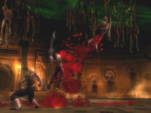 gleichzeitig an. Am Ende müsst ihr den Feind mittels eines Fatalities besiegen, der daraufhin in euer ständiges Repertoire wandert. Außerdem gibt es noch den »Multality«, mit dem ihr mehrere Gegner auf einmal fertig machen könnt sowie den »Brutality«, in dem ihr einen überstarken Spezianlangriff eures Helden selbst steuert.Neben den Fatalities lernt ihr mit der Zeit auch neue Möglichkeiten, in den Levels voranzukommen: Das geht bei einem extra-weiten Sprung los, später lernt ihr Statuen zu zerbersten, an Wänden zu klettern oder an ihnen entlangzulaufen und an Pfählen zu schwingen. Da bereits gemeisterte Levels jederzeit wieder besucht werden können, lohnt es sich, das mit einer neu erworbenen Fähigkeit mal auszuprobieren – mehr Gegner und noch mehr Geheimnisse warten! Ihr findet wie so oft jede Menge Bonusmaterial, seien es Artworks, Filmchen oder neue Arenen bzw. Charaktere für den Mehrspielermodus. Außerdem nützt das Hin- und Hergerenne, um euch die Position von Speicherpunkten einzuprägen, denn nur an diesen leuchtenden Altären dürft ihr den Spielstand sichern. Leider sind die sehr unregelmäßig verteilt: Mal vergehen zwischen zweien fünf Minuten, mal ist man eine gute Dreiviertelstunde ohne Speichermöglichkeit unterwegs! Geht ihr drauf, seid ihr auch von der Gnade der Rücksetzpunkte abhängig – mal fangt ihr direkt wieder im selben Raum an, mal müsst ihr komplette Abschnitte wiederholen. Besonders lästig sind in diesem Zusammenhang die teilweise