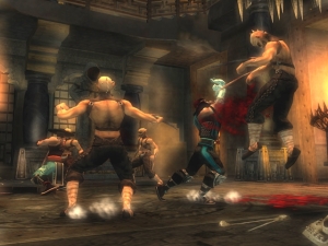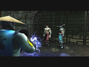 jederzeit alle beide Helden zu sehen sind, auch wenn man nur allein unterwegs ist. Wer lieber gegeneinander statt zusammen antreten will, findet natürlich auch das klassische Mann gegen Mann – allerdings nicht im normalen MK-Stil, sondern auch mit frei begehbarer 3D-Arena und Waffen; ganz wie die Solovariante, nur auf ein Areal begrenzt.Fans der Serie werden in Shaolin Monks mehr Déjà-vus haben, als Fehler in der Matrix existieren können: Ihr trefft auf bekannte Charaktere wie Sonja Blade, Jonny Cage, Barakka, Sub-Zero, Scorpion, Reptile, Kitana, Rayden oder Kintaro – teils als Freund, teils als Feind. Manche kämpfen an eurer Seite oder brauchen eure Hilfe, anderen begegnet ihr nur in Zwischensequenzen. Durch die Story entfalten sich einige interessante Hintergrundinfos für Kenner: Man erfährt, warum Sonja in MK2 gefangen war, wo Sub-Zero seine Narbe her hat und man sieht Shao Kahn mal ohne seinen Helm. Außerdem wurden die Levels aus den ersten beiden Spielen recycelt und entfalten in 3D eine ganz neue Wirkung: Goros Grube, Outworld, der lebende Wald oder der berüchtigte Raum mit den vielen, vielen Spitzen an der Decke – alle sind vorhanden. Und nicht zuletzt warten die altbekannten »Test your might!«-Reaktionstests, bei denen ihr wie wild auf eine Taste hämmern müsst, um Bretter zu zerschlagen oder eine Kraftprobe mit Baraka zu