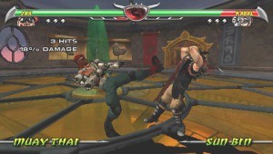 Auch technisch folgt Unchained Deception auf dem Fuße: Die an Plastikfiguren erinnernden Mannen kloppen sich steif animiert durch ansehnliche Levels – und wie bei der DoA-Serie könnt ihr die Kulisse ab und an zu eurem Vorteil nutzen! Da fliegt der Gegner schon mal durch Wände durch, ein paar Stockwerke tief oder in Stacheln hinein, was meist mit dem schnellen Ende quittiert wird. Und natürlich sind auch die guten alten, sehr blutigen, von einem bodenlos tiefen »Finish Him!« eingeleiteten Fatalities enthalten, hier noch in der »Schnell eine Tastenkombination eingeben, zurücklehnen und genießen«-Variante statt der öden Bastel-einen-Fatality-Version aus Armageddon. Insgesamt kann die Präsentation nicht mit Tekken: Dark Resurrection <A class=DYNLINK onmouseover="DynToolTipp_Show('Klicken für Gameinfos‚)“ onmouseout=“DynToolTipp_Hide(); “ href=“javascript:DynCont_Display(‚Gamefinder‘,’runmod.php?sid={SID}&LAYOUT=dyncont_gf&spielid=9321′)“>