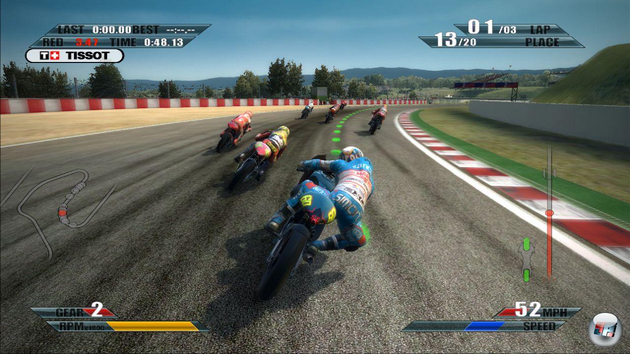 Der Mehrspielermodus ist ein zweischneidiges Schwert: Über die Internetleitung dürfen bis zu 20 Online-Piloten an den Rennen teilnehmen und sich über einen angenehm stabilen Netzcode freuen – zumindest auf der Xbox 360. Mit der PS3-Version gibt es dagegen immer noch massive Probleme, überhaupt in eine der gelisteten Lobbys zu kommen. Hat man es trotzdem mal geschafft, droht dennoch das vorschnelle Aus, da der Host nicht automatisch auf einen anderen Spieler übertragen wird, sobald sich der aktuelle Gastgeber ins Offline-Universum verabschiedet. Schön ist, dass man nicht ewig auf die langweiligen Menüs starren muss, während man auf das Ende eines laufenden Rennens wartet. Mit Hilfe der Zuschauer-Funktion verfolgt man die Positionskämpfe live mit und kann dabei auch zwischen den Piloten umschalten. Legt man eine eigene Session an, hat man die Wahl zwischen Karriere- und Arcade-Rennen sowie der Motorrad-Klasse. Zudem dürfen KI-Fahrer ins Starterfeld aufgenommen und private Slots für Freunde reserviert werden. Aber was ist mit der Streckenwahl, Rundenanzahl oder Wetter? Solche Einstellungen sucht man vergeblich. Kein Wunder, denn diese Details werden erst per Abstimmung unter den Session-Teilnehmern geklärt. Leider kann man erst eine Auswahl präsentieren, sobald sich mindestens ein weiterer Spieler in der Lobby befindet. Zwar wird auf eine System Link-/LAN-Funktion verzichtet, doch wird als Ersatz auch ein Splitscreen für zwei Spieler geboten, der entweder vertikal oder horizontal geteilt werden darf.