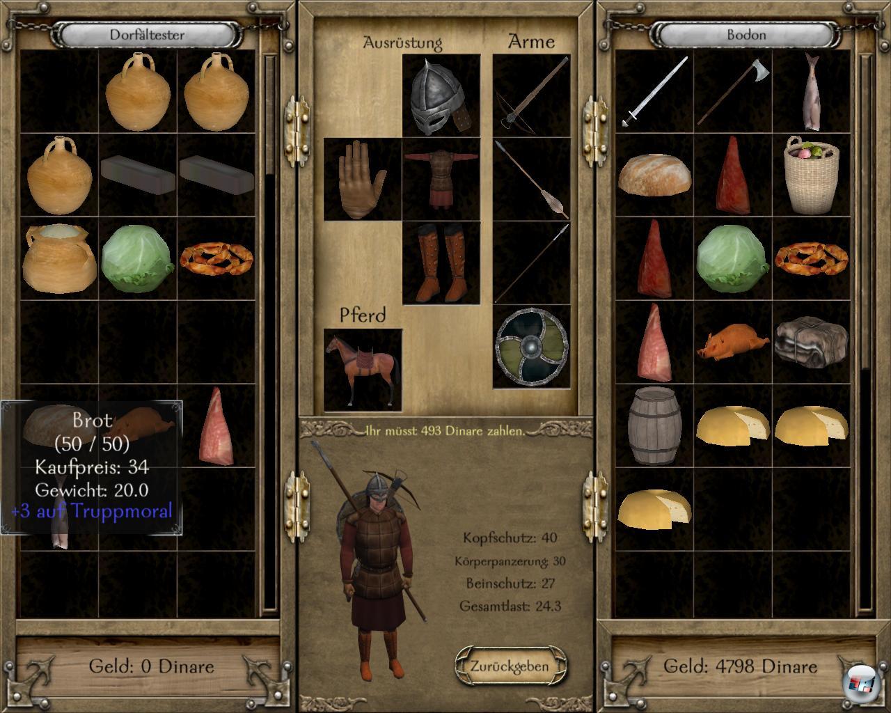 Eines müsst ihr bei euren Mannen nicht machen: Sie mit Waffen und Rüstung ausrüsten, da das automatisch geschieht; lediglich die Gefährten lassen sich ausrüsten. Anders bei euch selbst, denn ihr solltet regelmäßig Neues ausprobieren. Da gibt es je nach Geschmack Beinschienen, Schilde, Kettenhemden, Lederpanzer, eiserne Harnische, Topf- und Wikingerhelme von ganz billig und kaum haltbar bis ganz teuer und ewig haltbar. Mittelalterliche Waffen gibt es mannigfaltig zum Werfen, Schlagen, Zustoßen, Hacken und Abschießen. Pferde gibt’s in jeder erdenklichen Art, Geschwindig- und Wendigkeit. Die Preise sind gesalzen, weshalb Bescheidenheit eine eurer Tugenden sein sollt. Aber das sind Ritter ja von Natur aus.