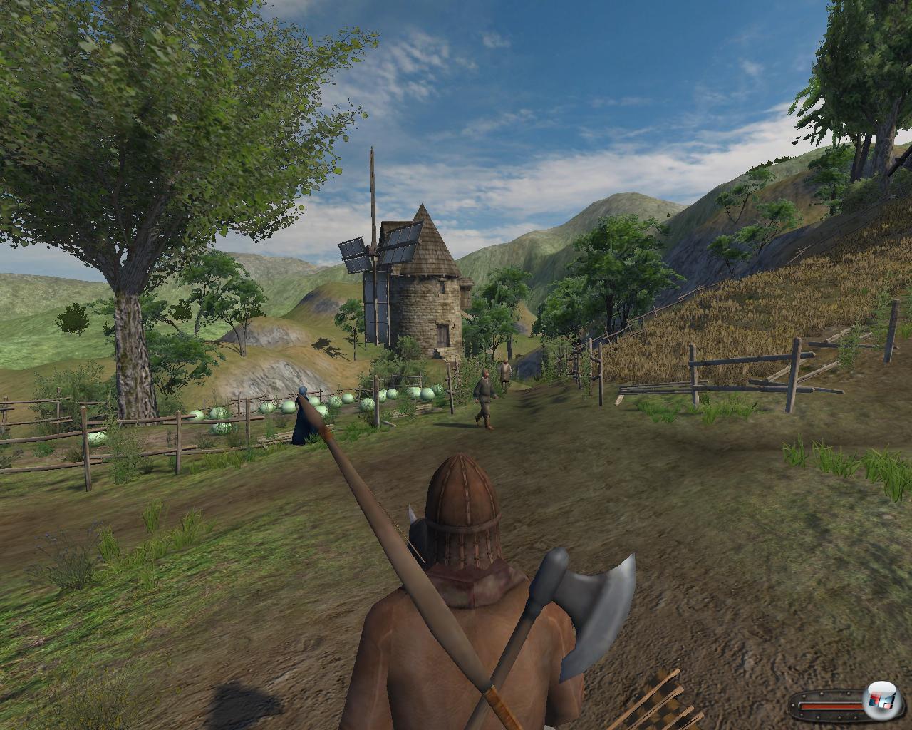 Obwohl es landschaftlich nicht so schön ist, sind doch die Rüstungen und Waffen gelungen. Ihr bestimmt frei, wie euer Kämpe aussehen soll: Ein edler Ritter ganz in Eisen mit Topfhelm, V-Schild und Turnierlanze, ein Nomade, der an Mongolen erinnert, mit Pfeil, Jagdbogen und Fellstiefel oder doch lieber ein Wikinger mit Streitaxt, Brillenhelm und Rundschild. Sogar beim Kämpfen ist eure Rüstung und Bewaffnung zu sehen. Obschon die Spielwelt fiktiv ist, lehnt sie sich doch an die Historie an. Anders als zuletzt bei Crusaders erweckt hier vieles wirklich den Eindruck des Mittelalters. Freilich seid ihr nicht daran gebunden, denn ihr könnt wild mischen, wie ihr das möchtet. Dann tragt ihr eben eine Art Räuberzivil, was aber niemand zu stören scheint – nicht einmal die feinen Edelleute auf ihren Burgen, bei denen ihr vorsprecht; dennoch wollen sie euch bisweilen nicht kennen.
