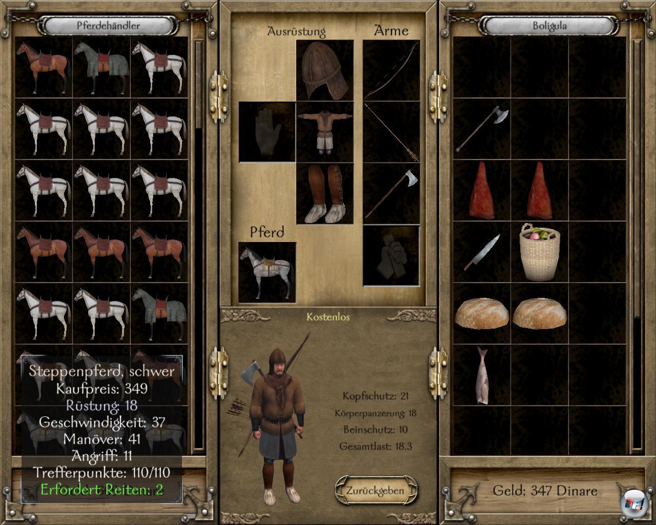 Obwohl der Handel bei Leibe nicht so kompliziert ist, macht es dennoch Spaß, die besten Routen auszukundschaften. Hat euer Charakter Kenntnisse im Handel, tut er sich leichter, sich die Preise der Waren zu merken. Leider ist die Wirtschaft nur leidlich dynamisch, denn wenn ihr viel von einer Ware verkauft, geht der Preis gerade mal ein wenig in die Knie. Ansonsten ist alles ziemlich berechenbar, was natürlich auch dafür sorgt, dass sich euer Geldbeutel stetig füllt. Fiese Naturen könnten auch auf die Idee kommen, die reichen Karawanen auszurauben, die ihr immer trefft und die allerdings bewacht sind. Aber ein ehrenhafter Ritter macht doch so was nicht, denn das gefällt den Burgfräulein sicher nicht.