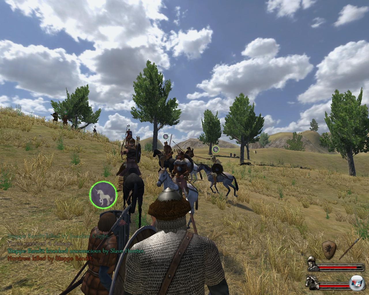 Die spannenden Kämpfe sind daher auch im Singleplayer immer noch da A und O, da es immer noch Freude macht, inmitten seiner Kämpfer auf den Feind zuzureiten, ihn zu umkreisen und dann zu jagen. Man kämpft mit originalgetreuen mittelalterlichen Waffen und Rüstungen gegen vagabundierende Räuberbanden, einfallende Wikinger oder feindliche Ritter, was Ansehen bringt. Ein Sieg über ebenbürtigen Gegner ist dabei immer mehr wert. Während der Schlacht kann man zwar nur eine Hand voll taktische Befehle geben, aber sein Kampfgeschick durch Gebrauch verbessern. Das gilt auch für die aus Helden, Handwerkern und Soldaten bestehende Party, die nach jedem Gefecht aufsteigt.