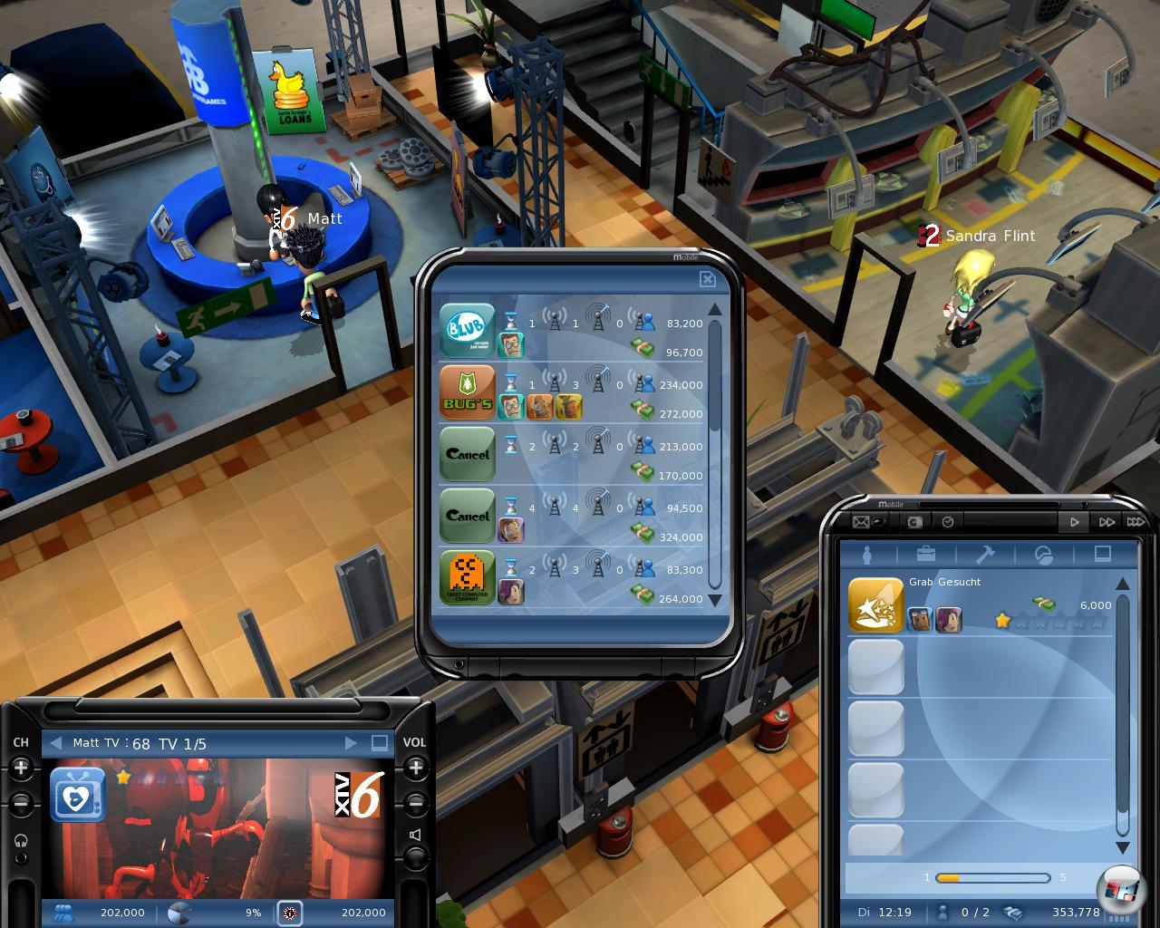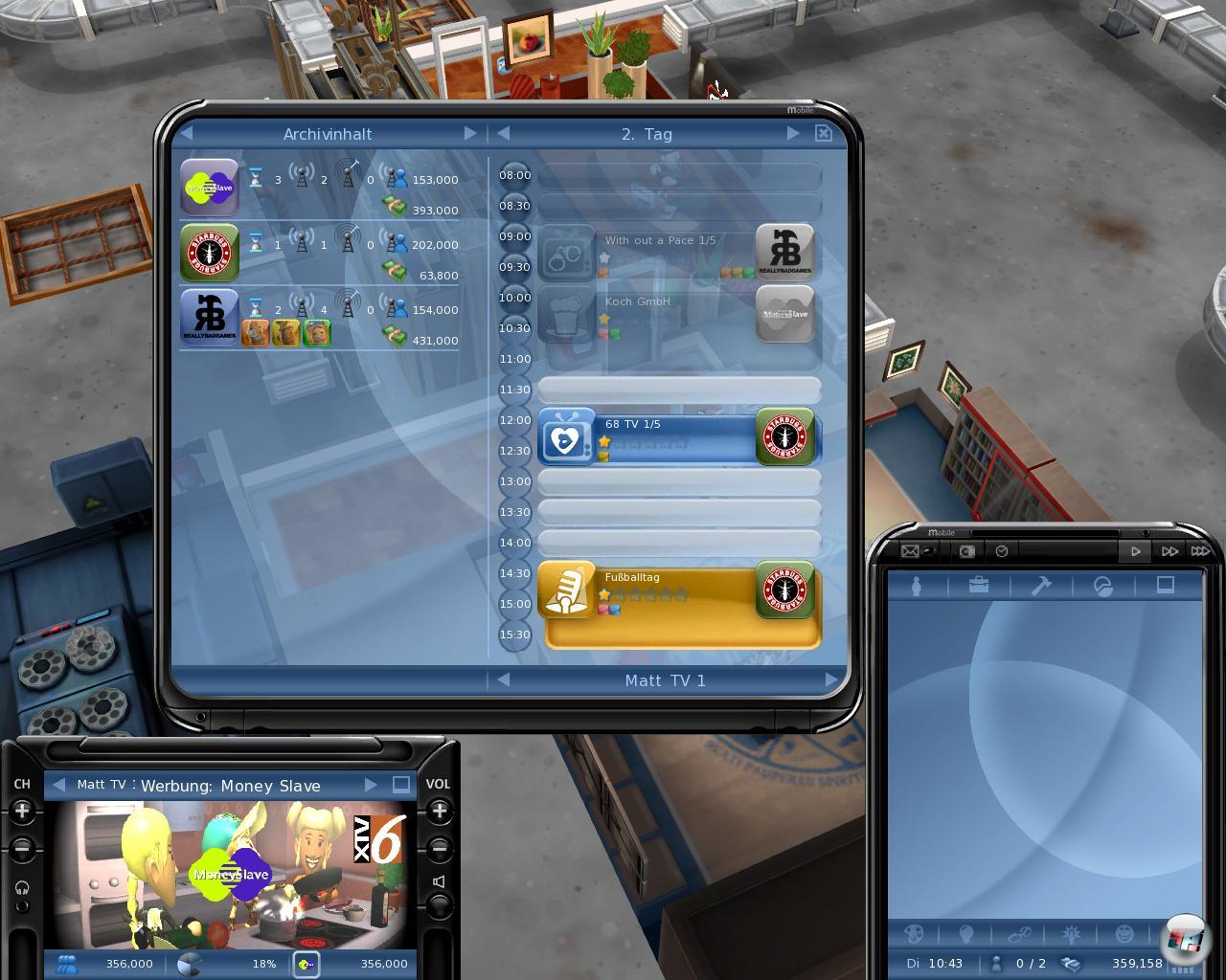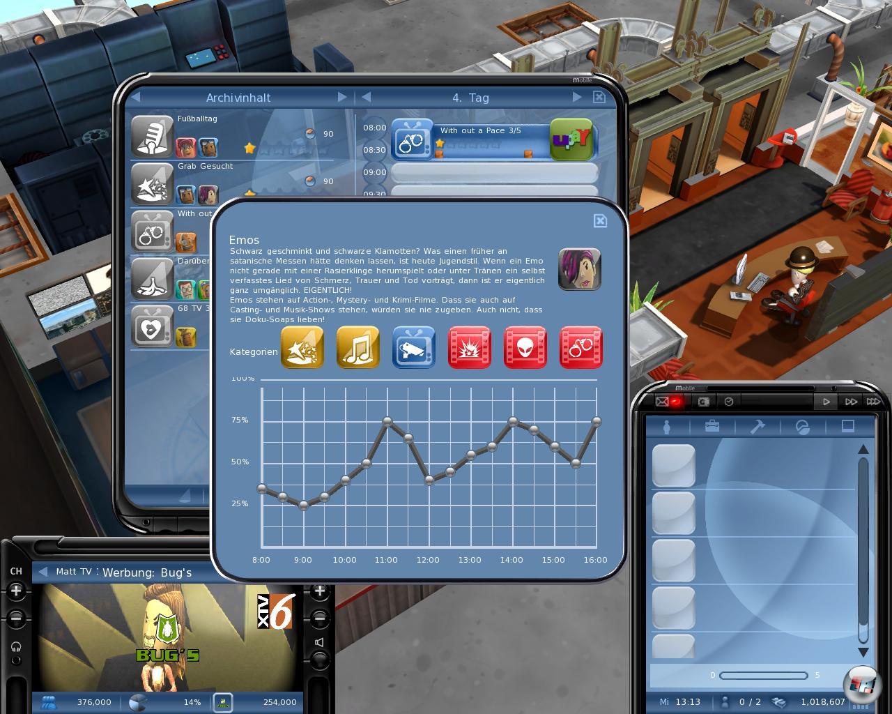 Was zählt, ist nämlich die Quote – sprich die Leute, die sich das tatsächlich anschauen. Die Vorlieben muss man immer im Auge behalten und evtl. darauf reagieren. So kann man auch eigene Sendungen für die Zielgruppe produzieren, wofür man natürlich ein Konzept, Leute und ein Studio braucht, was ganz schön ins Geld geht. Und wenn das trotzdem nicht reicht? Wenn die Konkurrenz mehr Marktanteile hat, kann man sie auch sabotieren. So weit die durchaus interessante Theorie, die man sich im dreiteiligen Tutorial zu Gemüte führen kann, das leider sporadisch abstürzte; aber keine Bange: das Hauptspiel lief dann sauber.