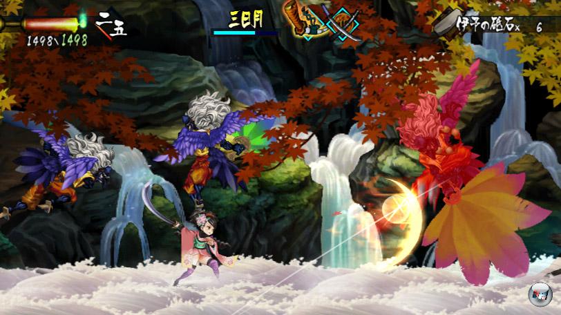 Die Wahl der Waffe ist mehr als nur Makulatur, denn jedes der insgesamt 108 Schwerter hat unterschiedliche Eigenschaften – mehr Angriffsschaden, höhere Geschwindigkeit oder zusätzliche Verbesserungen wie Feuer. Neues Schneidwerkzeug gibt es auf zwei Arten: Entweder von gefallenen Bossgegnern; diese Schwerter sind die wichtigsten, sorgen sie doch dafür, dass man mit ihnen vorher undurchdringliche Barrieren durchbrechen und somit neue Spielbereiche erkunden kann – eine leichte Verbeugung vor dem Metroid-Spielprinzip. Die andere Art an neue Säbel zu kommen nennt sich »Schmiede«: Bereits nach kurzer Spielzeit hat man Zugriff darauf, so dass man seine eigenen Schwerter zimmern kann. Das klingt allerdings freier als es ist, denn gleich mehrere Dinge stehen dem kommenden Schwertmeister im Weg: Zum einen braucht es für die meisten Klingen bestimmte Stärkegrade, um sie tragen zu können – die kommen im Laufe des Spiels aber automatisch, da man mit jedem Kampf an Erfahrung gewinnt und damit über kurz oder lang im Rang aufsteigt. Außerdem braucht jede Waffe eine Mindestzahl an Seelen und Geistern, die man Sammeln muss – Seelen liegen überall grün schimmernd herum, Geister gibt es u.a. durch Nahrungsaufnahme.  Zum anderen kann man keineswegs einfach so sein Lieblingsschwert basteln, sondern einfach nur nach und nach fertige Säbel freischalten, von denen man sich dann drei ins Inventar packt. Diese Schwerter sind die einzige Art von frischen »Skills«, die man dazu gewinnt – ansonsten bleiben die Fähigkeiten von Momohime und Kisuke das ganze Spiel lang unverändert. Dazu zählt leider auch, dass die beiden lediglich per Druck auf die Nach Oben-Taste springen (bzw. doppelspringen und gleiten) können, diese Funktion darf nicht auf einen Button gelegt werden, was sehr ärgerlich ist. Zwar gewöhnt man sich irgendwann daran, aber in einem schnellen Actionspiel hat dieser Zwang trotzdem nichts verloren.