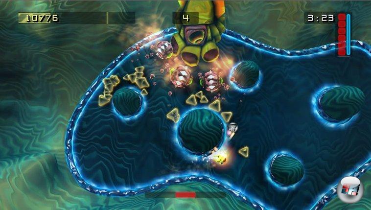 Nicht nur er ist toll animiert: Sämtliche Exemplare der farbig glühenden Gegner haben erfreulich viele, flüssig ineinandergreifende Bewegungsphasen spendiert bekommen. Dadurch wirkt die Action sehr dynamisch und lebendig. Beinah der komplette Bildschirm ist ständig in Bewegung. Auch die glänzenden Oberflächenstrukturen auf den Feinden und Hintergünden tragen ihren Teil dazu bei. Es wirkt beinah so, als hätten die Entwickler bewusst komplett auf Texturen verzichtet und statt dessen die Oberflächen mit schimmernden Strukturen versehen. Vielleicht belegt das Spiel deshalb nur gut 40 MB auf eurer Festplatte.