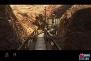 Fahrt ihr mit dem Mauszeiger über eine Stelle, wo eine Interaktion möglich ist, verändert er seine Form. So weit, so bekannt – recht gewöhnungsbedürftig ist aber, dass, um einen Schalter zu betätigen, nicht einfach nur Klicken reicht. Ihr müsst richtig daran ziehen, was oft etwas hakelig ist. Die Rätsel selbst kündigen sich meist mit einem Lupensymbol an, denn wo es auftritt, gibt es was zu entdecken. Das ersetzt freilich nicht das für Adventures typische Absuchen der Bilder, die sich frei schwenken und drehen lassen. Das ist aber auch schon das Höchstmaß an freier Bewegung, denn Myst IV läuft in festen Bahnen ab.